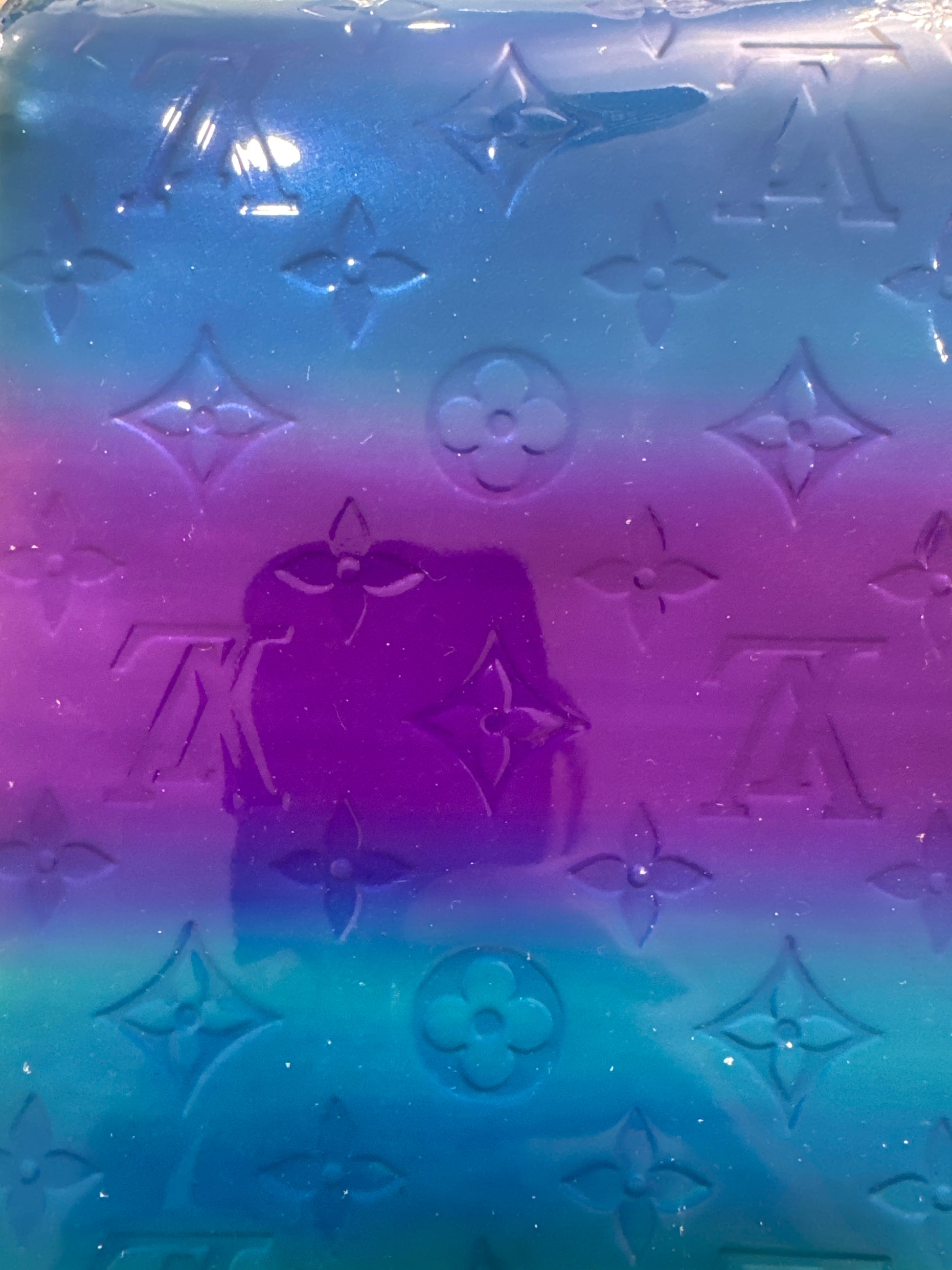This authentic upcycled LV Blue Haze is a hand dyed leather band with shades of blue and purple. Your liner, crystal, and hardware are customizable. Please specify your choice in the notes section at checkout.