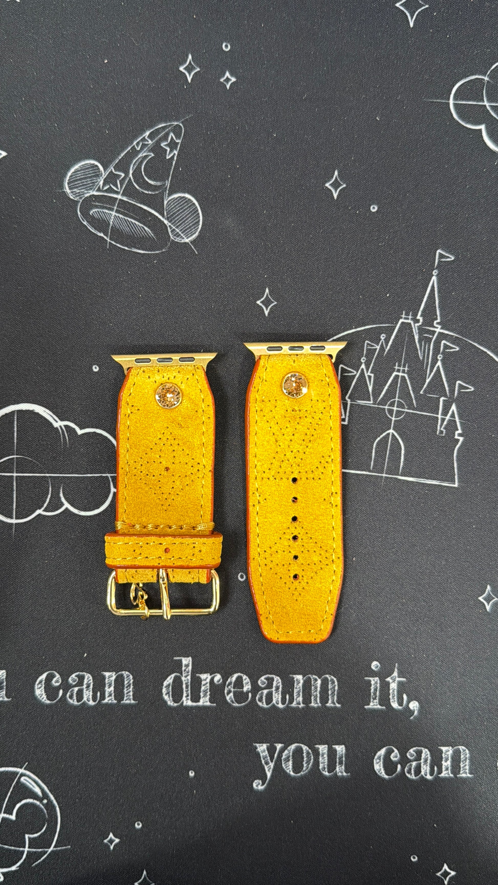 This is an authentic upcycled LV Mustard Mahina. It is a suede band material with the iconic LV monogram as the hole. Hardware and liner are designed to your liking.