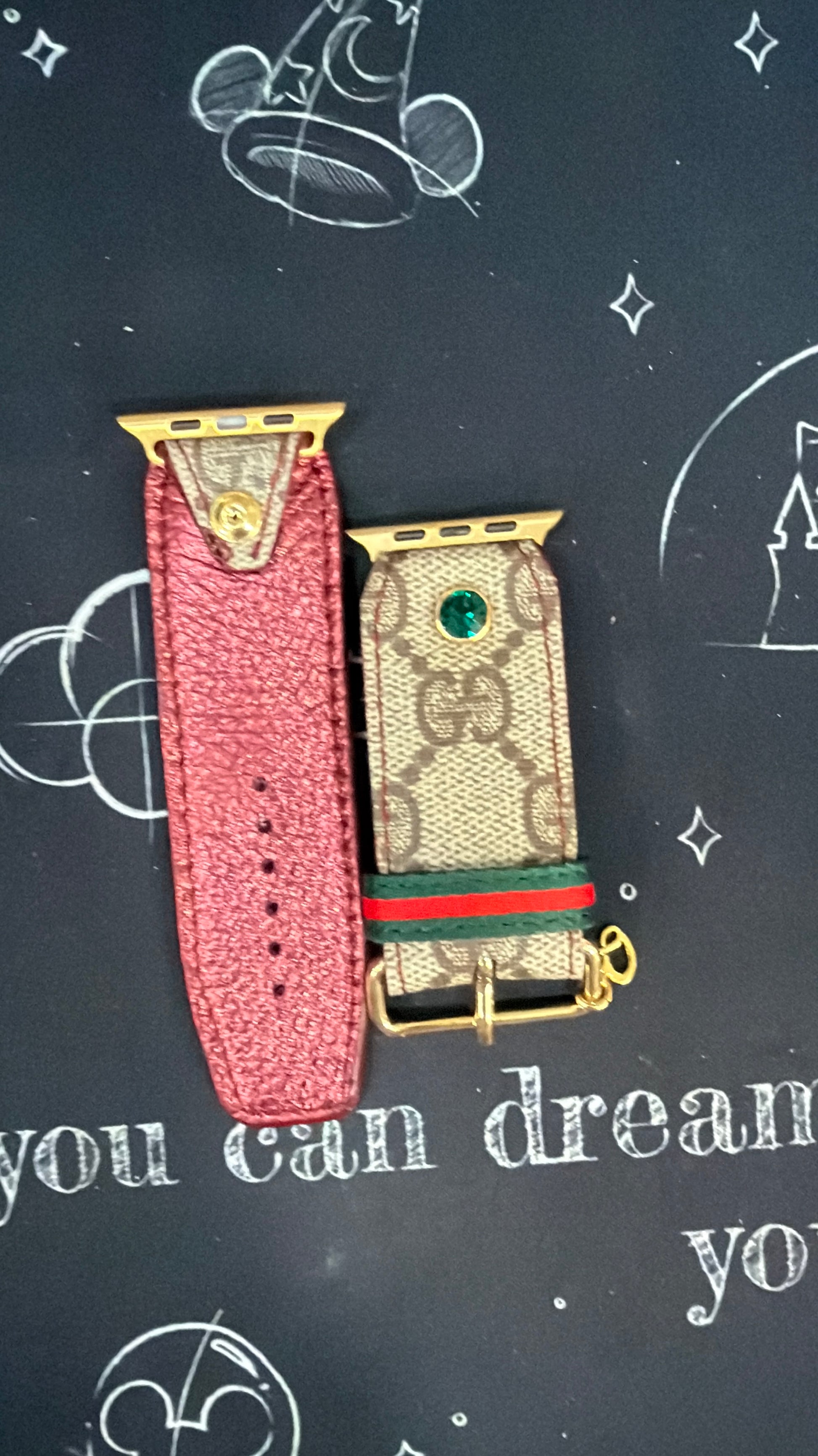 Traditional brown Webbed GG monogram pattern. The band is lined with metallic burgundy leather with matching thread and edge paint. Crystal and hardware are customizable.