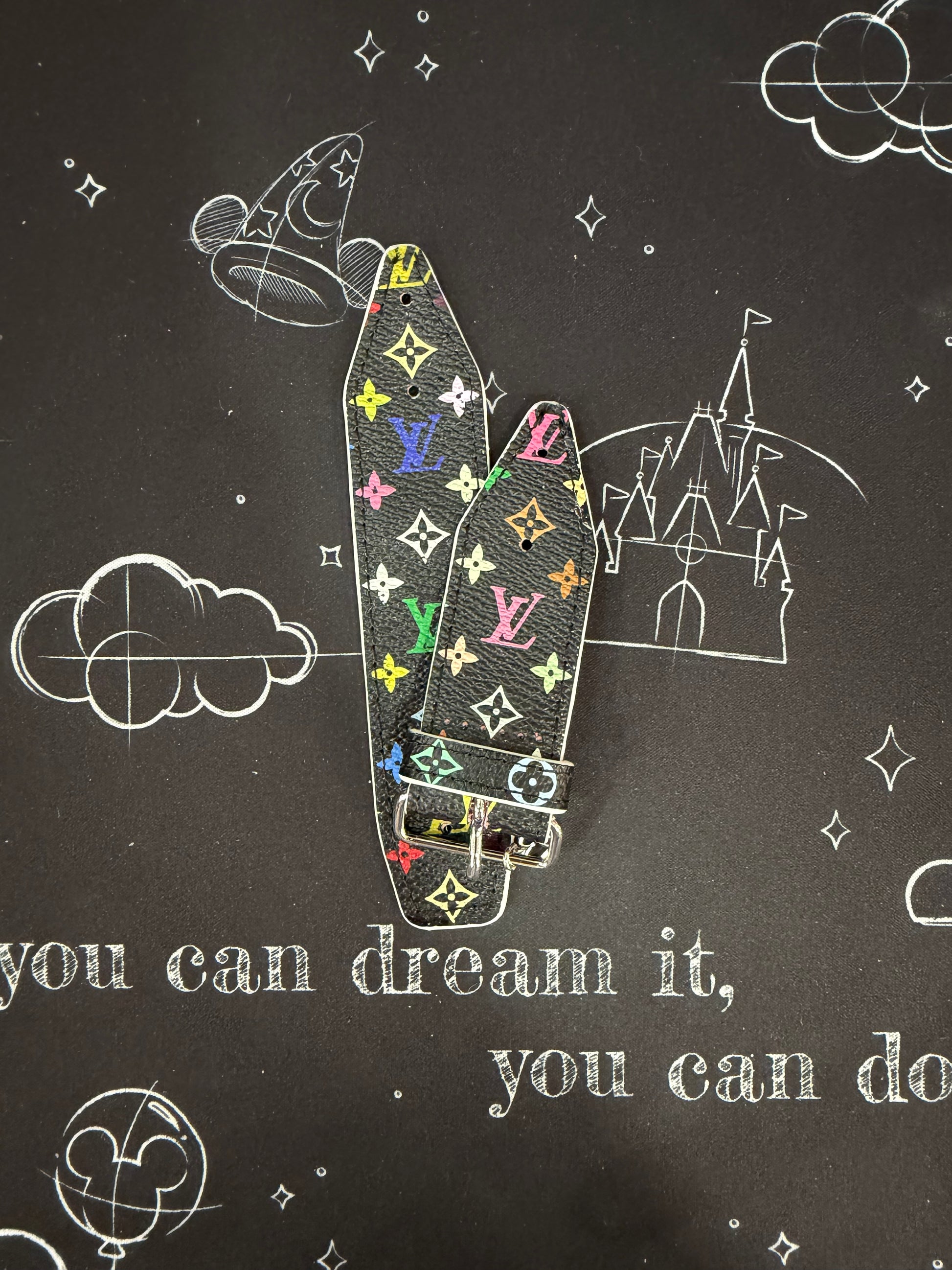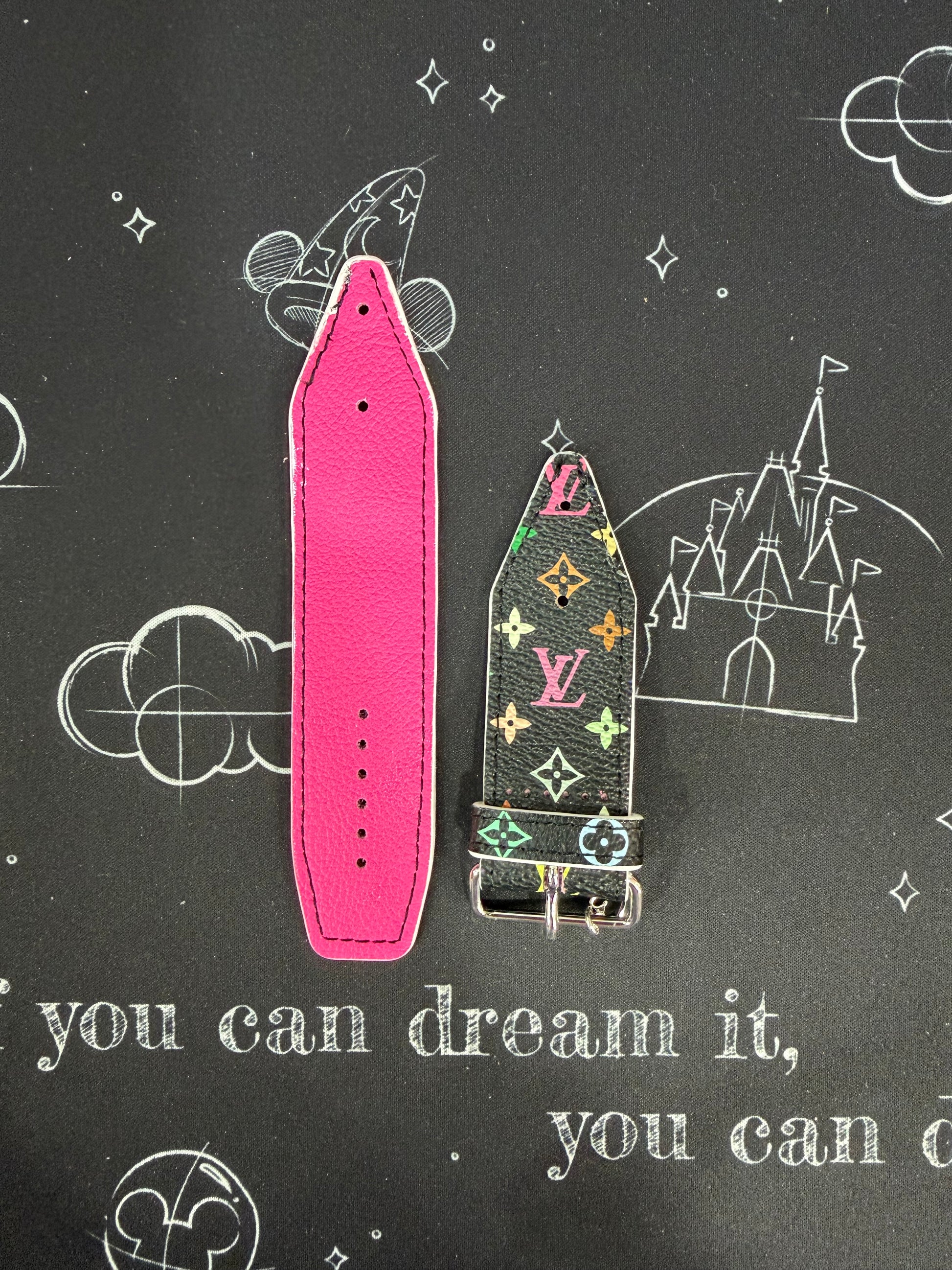 This is an authentic upcycled black mutlicolor LV band. A leather material with the classic LV monogram in multicolors on a background. Please in the notes section at checkout indicate your size, hardware color and preferred crystals.