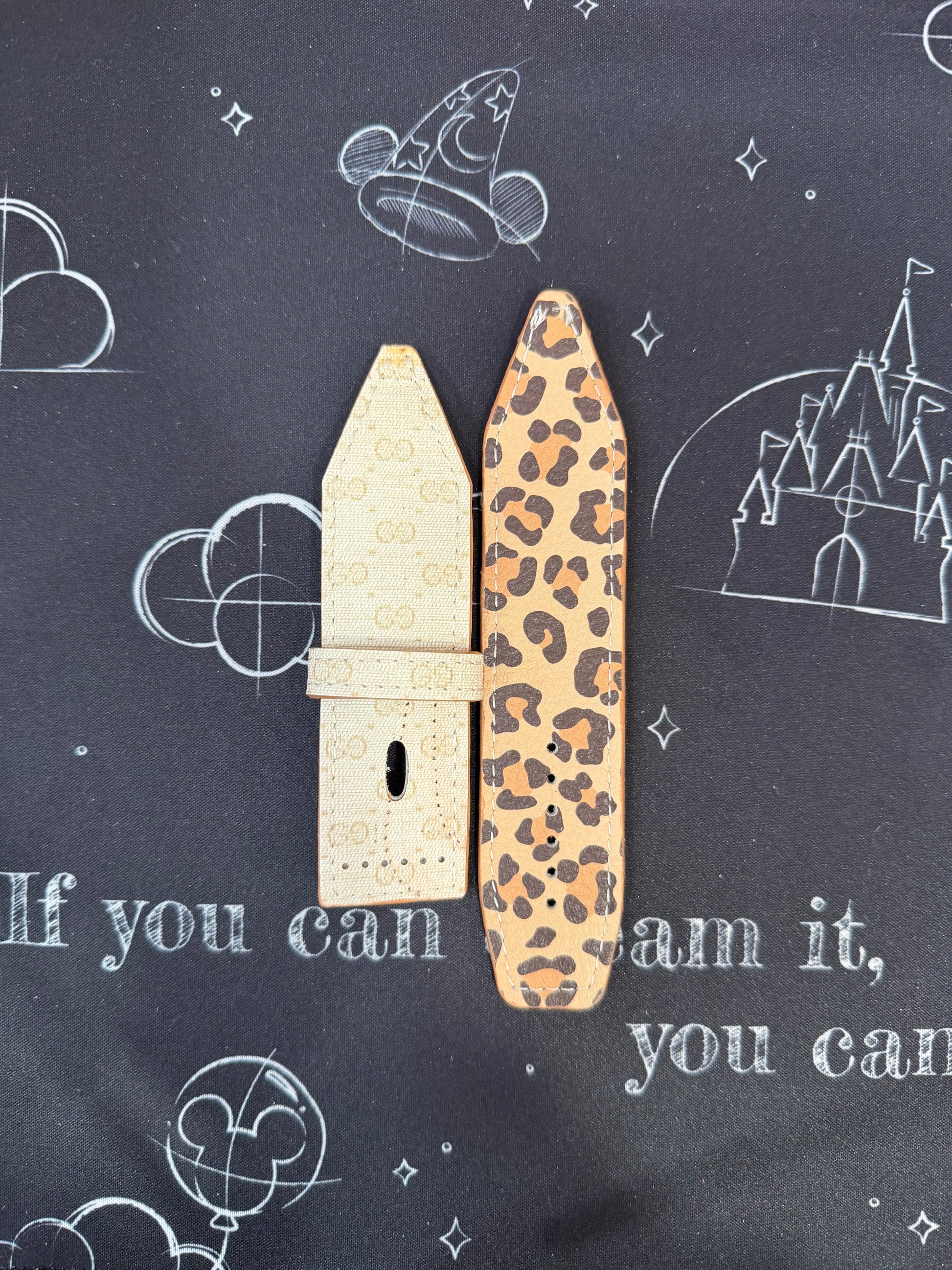 An authentic upcycled vintage Micro GG in cream with brown. The material is a coated canvas. The liner is leopard with a cream edge paint. Crystal and hardware are customizable.