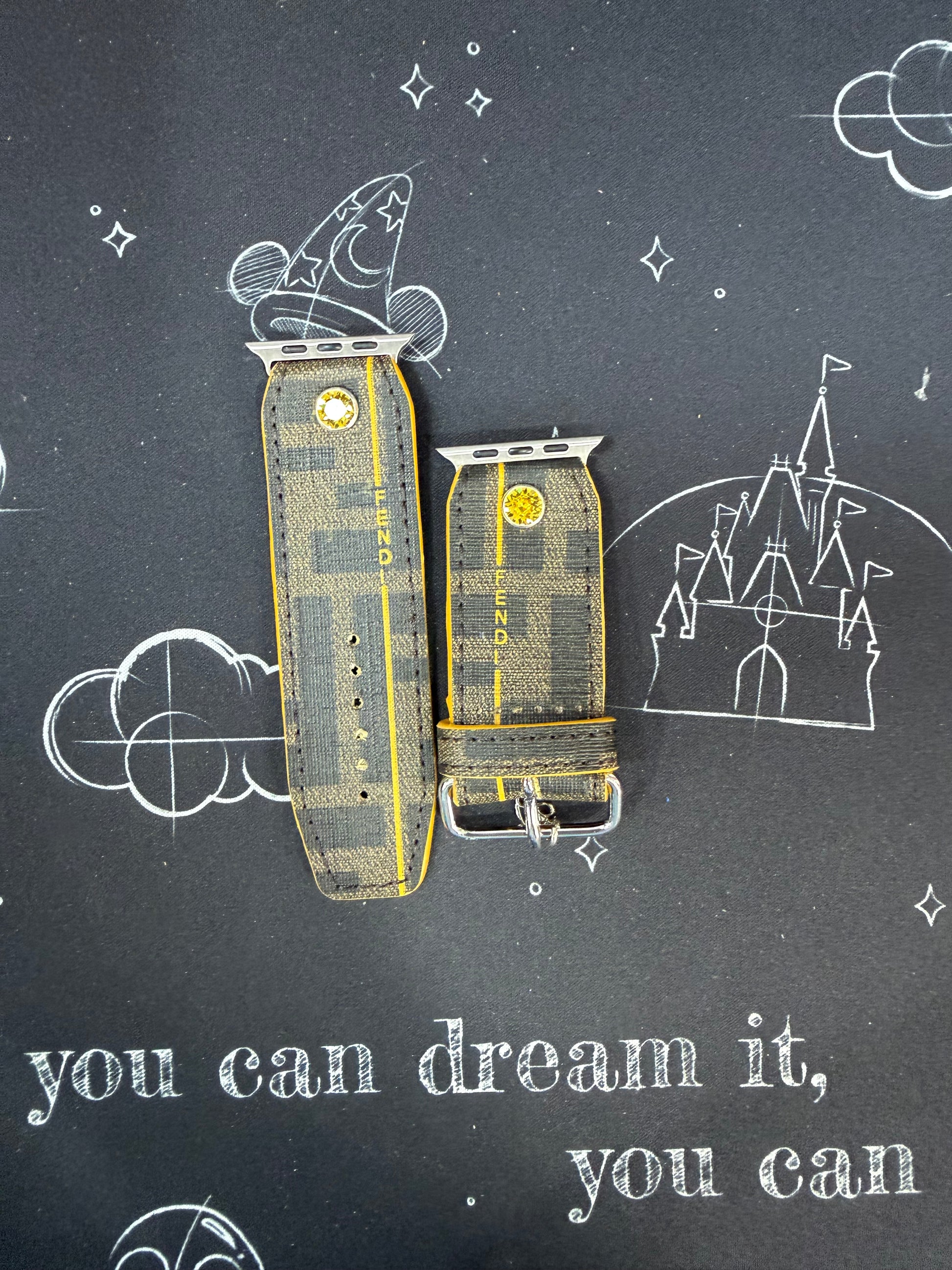 An authentic upcycled brown Fendi with a yellow stripe running vertically.