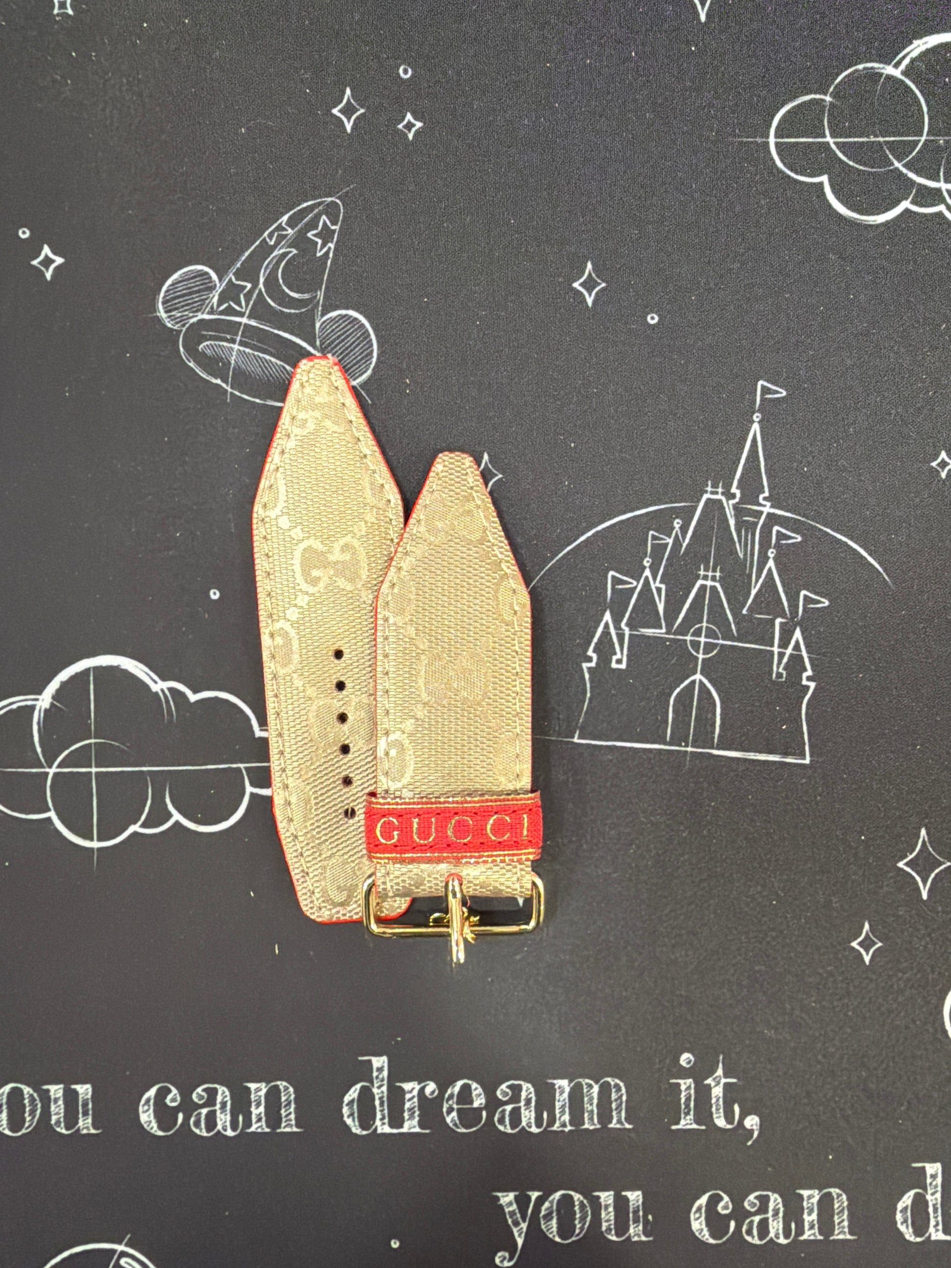 A coated canvas band made from an upcycled Gold GG. Your crystal, and hardware are customizable. Please specify your choice in the notes section at checkout.