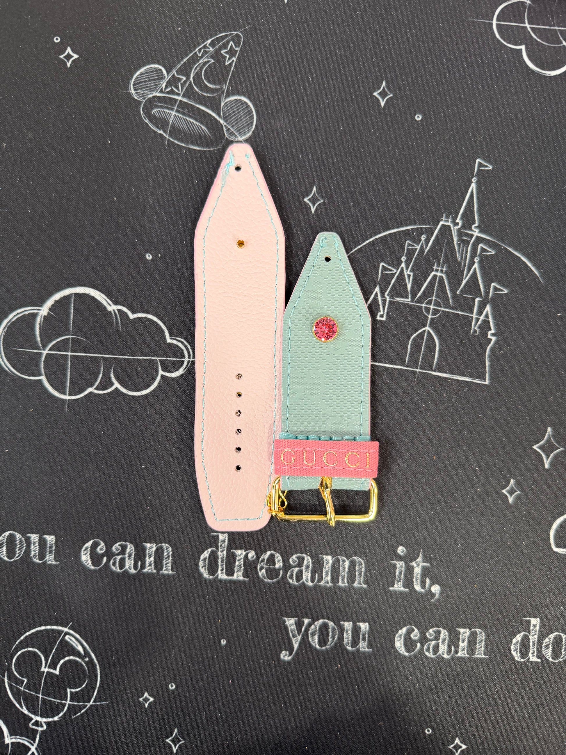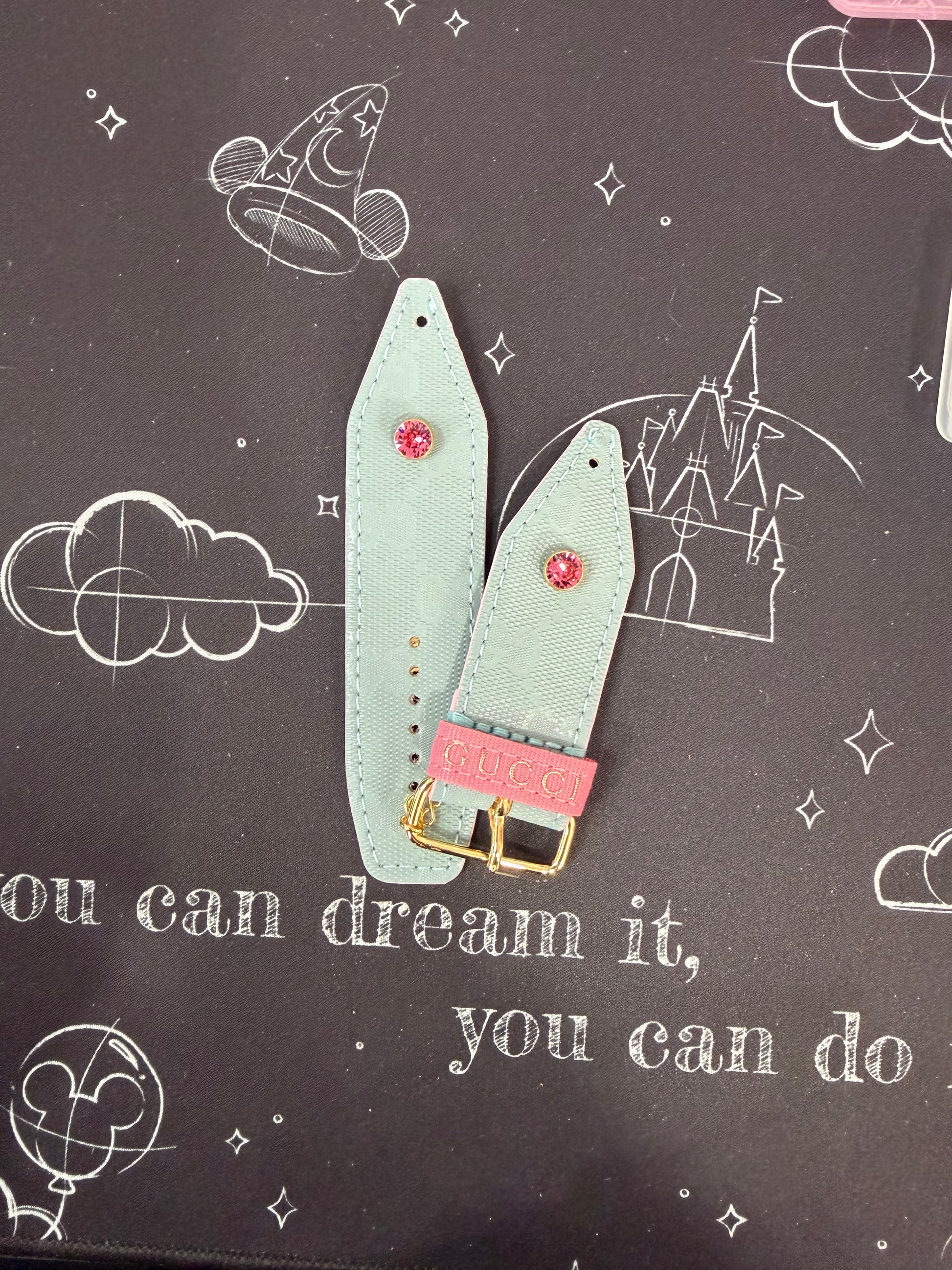 A coated canvas band made from an upcycled GG bag. Your liner and edge paint are baby pink with matching thread. crystal hardware are customizable. Please specify your choice in the notes section at checkout.