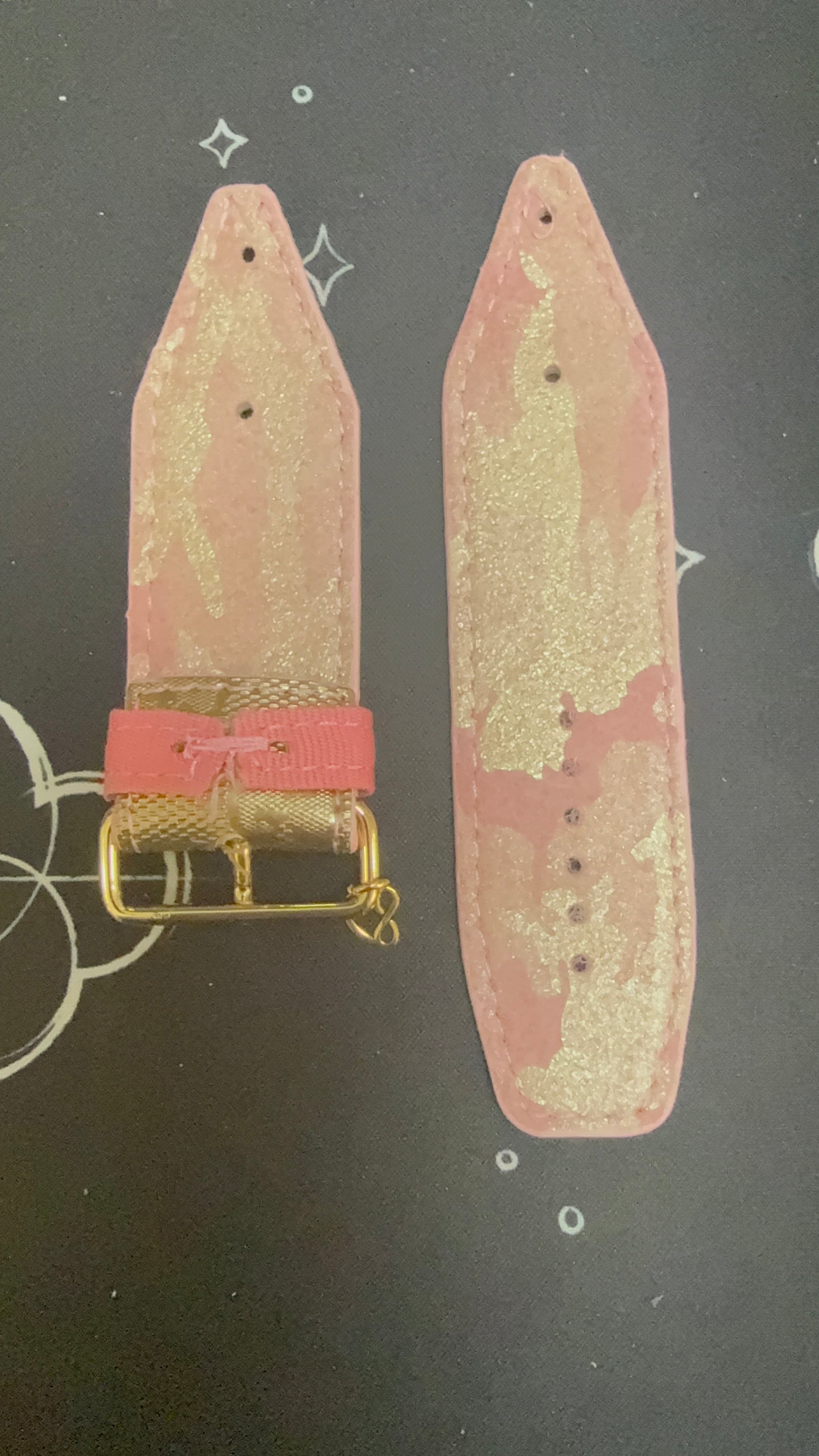 A coated canvas band made from an upcycled Gold GG. The edge paint is pink with a pink camo leather and pink thread.