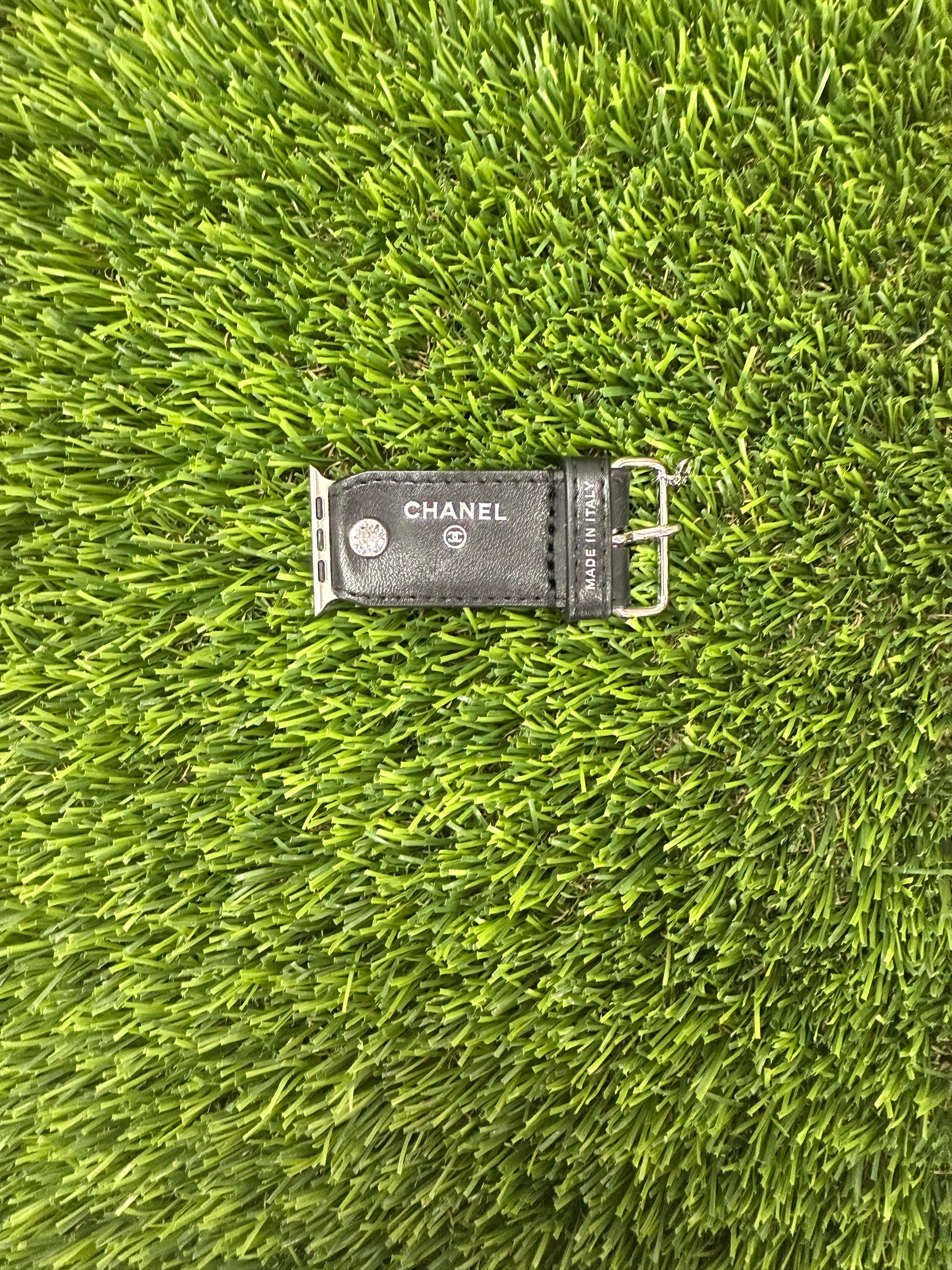 This band is a black leather band with a silver heat stamp of the Company name and symbol. A leather keeper that has a silver heat stamp as well with Made in Italy written on it. Customizable Crystal and hardware