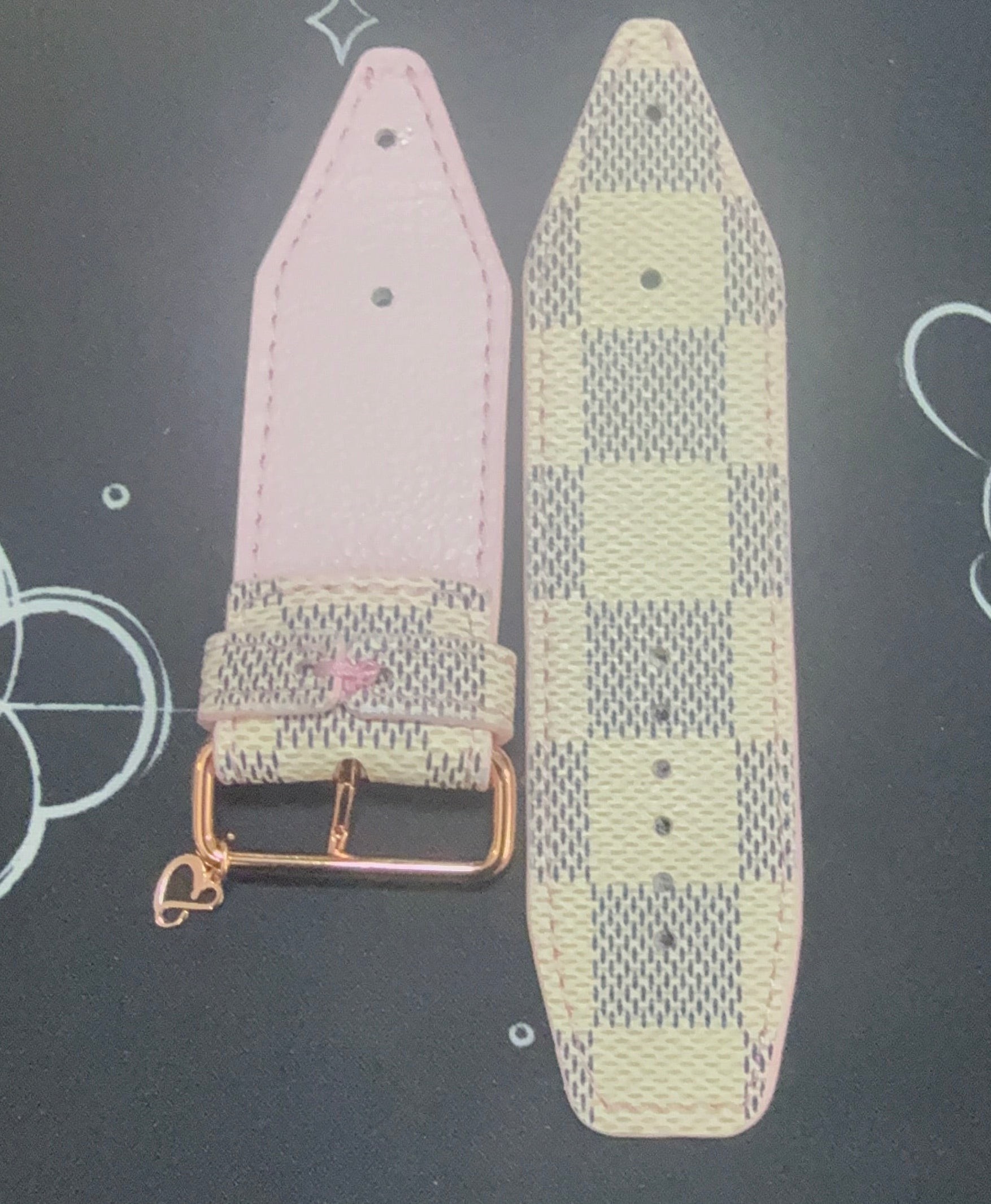 Esta es una auténtica banda Damier Azur LV reciclada. Un material de cuero con el LV Damier Azur. Este es nuestro estilo superpuesto con cuero color champán. Se combina con cristal AB con borde dorado y herrajes a juego. Sin embargo, su revestimiento, cristal y hardware son personalizables. Especifique sus personalizaciones en la sección de notas al finalizar la compra.