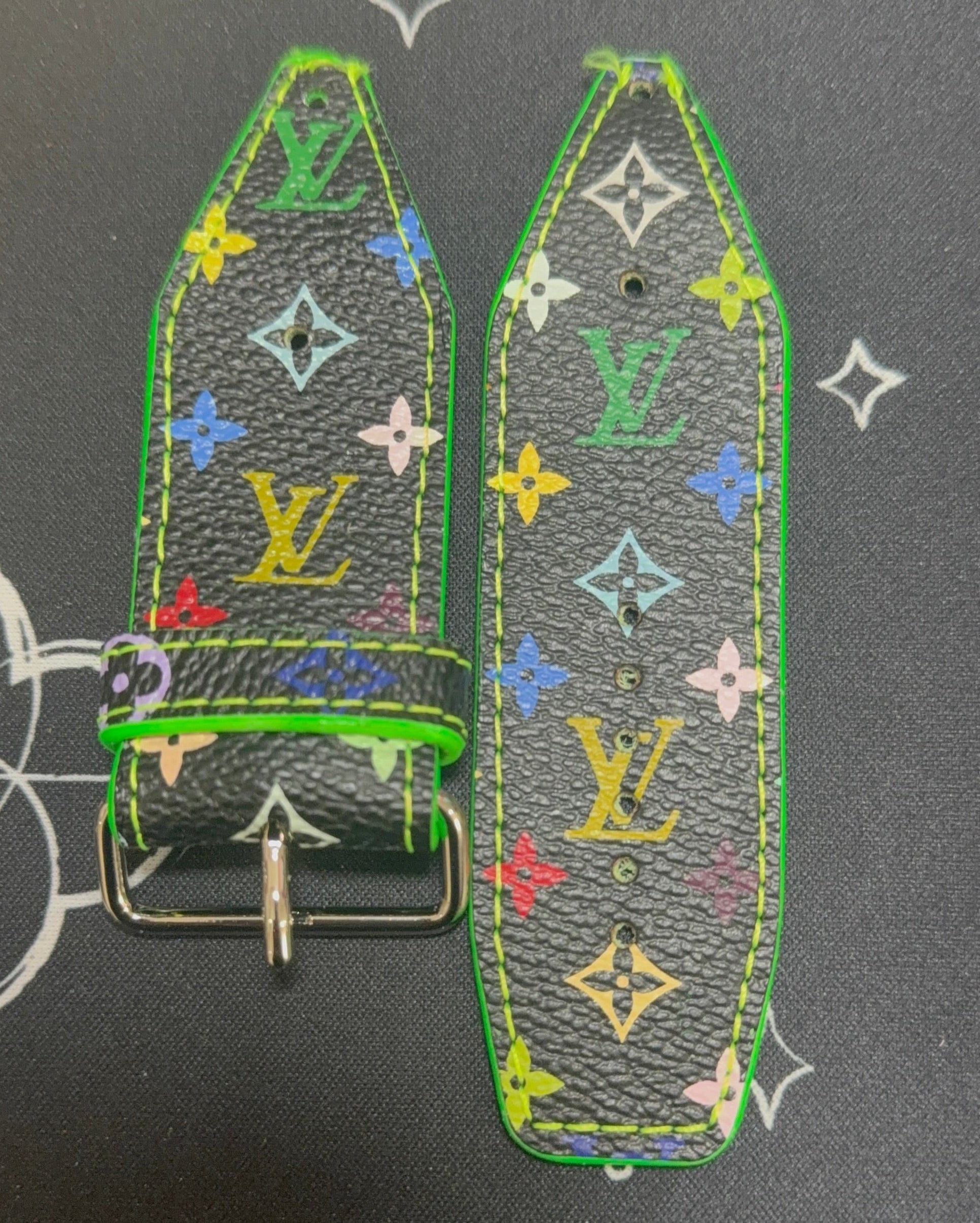 This is an authentic upcycled black mutlicolor LV band. A leather material with the classic LV monogram in multicolors on a black background. The band is line with a neon green leather and the edge paint to match. choice. Hardware and crystals are customizable.