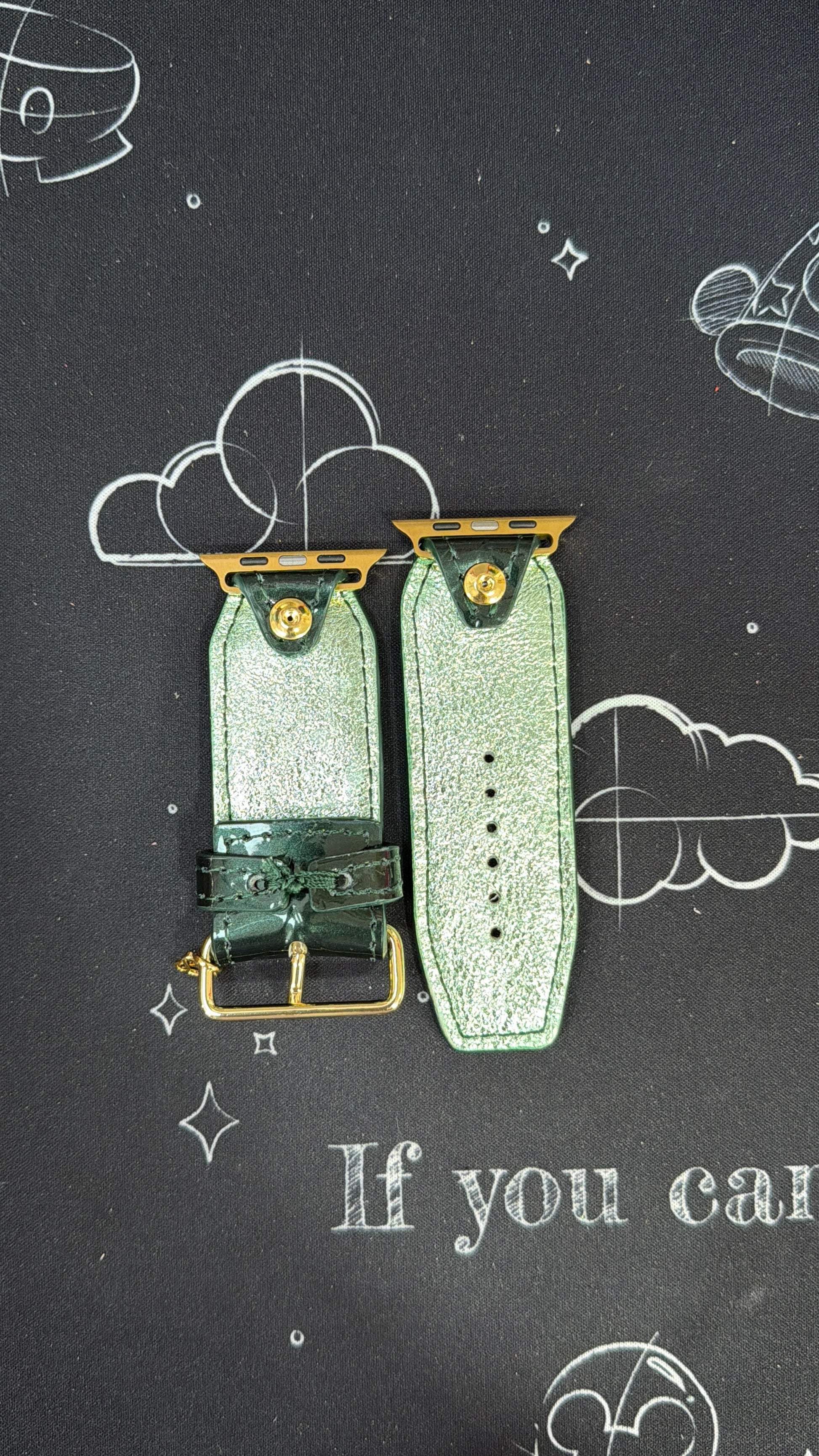 A patent leather Vernis band with a "Hunter Green" color. The liner is mint metallic and matching thread and edge paint. Hardware and crystals are customizable.