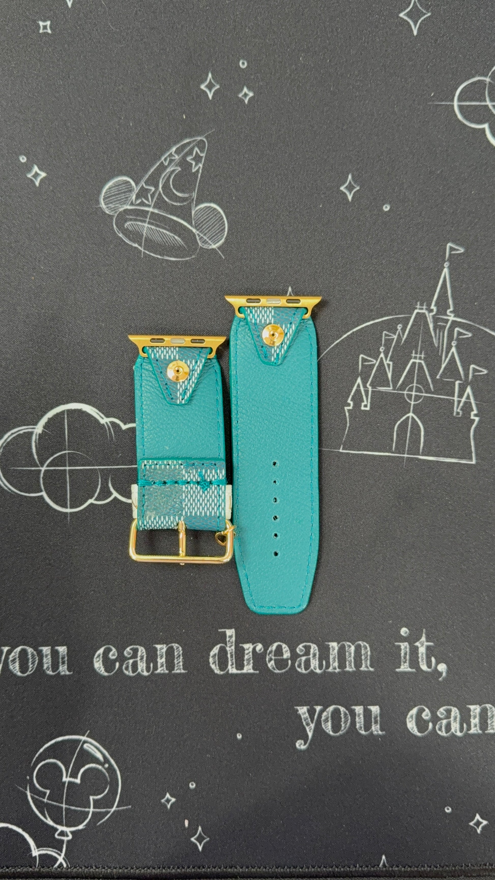 Esta es una auténtica banda Damier Azur LV reciclada. Un material de cuero con el LV Damier Azur. Este es nuestro estilo superpuesto con cuero color champán. Se combina con cristal AB con borde dorado y herrajes a juego. Sin embargo, su revestimiento, cristal y hardware son personalizables. Especifique sus personalizaciones en la sección de notas al finalizar la compra.