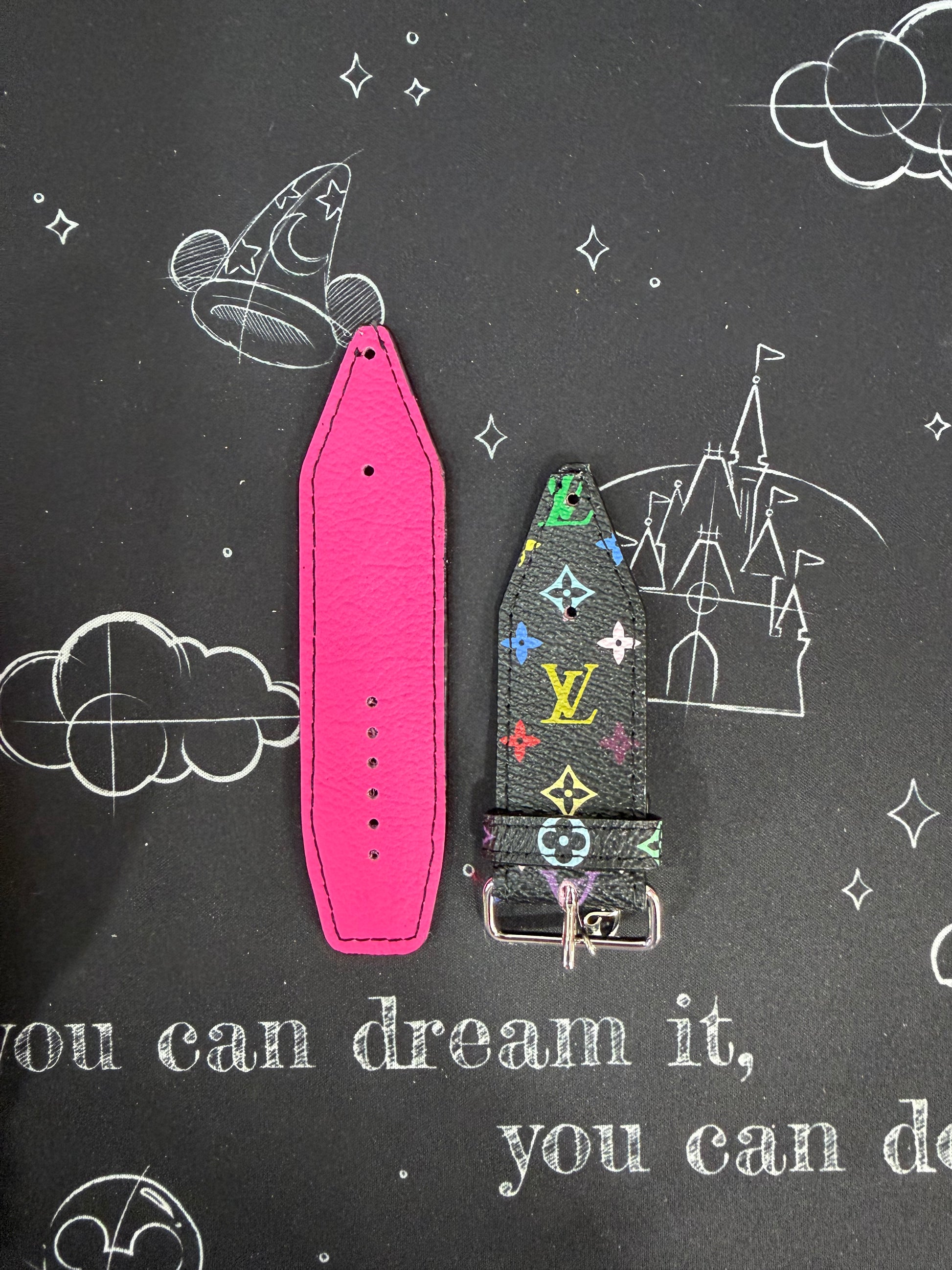 This is an authentic upcycled black mutlicolor LV band. A leather material with the classic LV monogram in multicolors on a black background. Please in the notes section at checkout indicate your size, hardware color and preferred crystals.