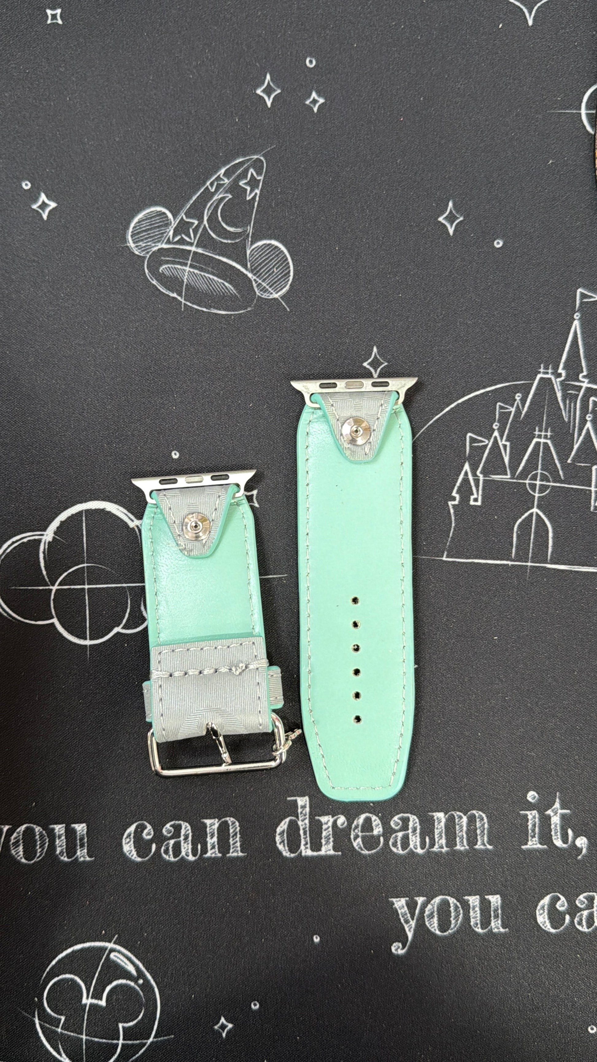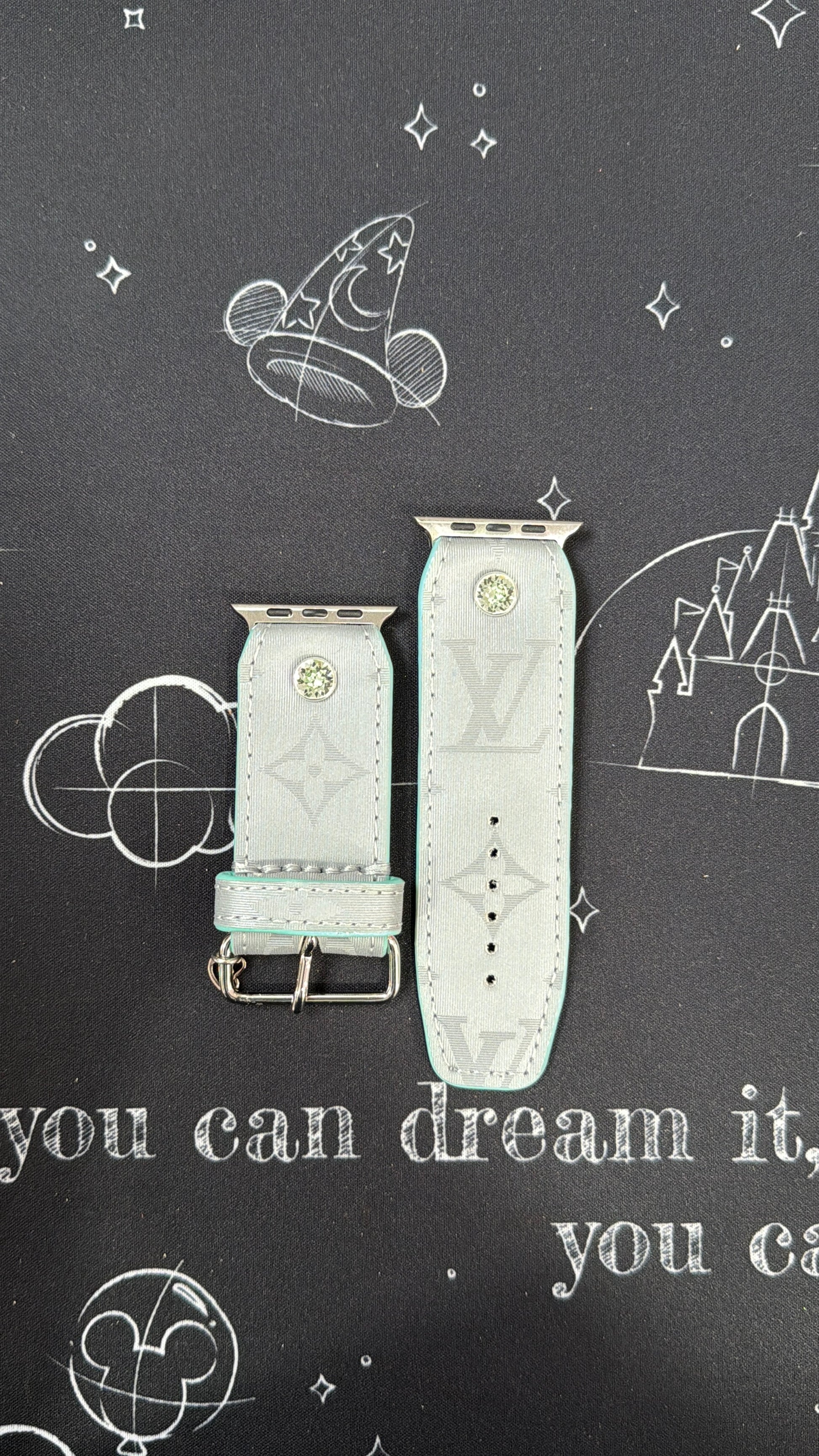 This is an authentic upcycled LV. It is a canvas band material with a protective coating that gives the band a holographic look. Band is lined with Pink disco ball with Pink edge paint and pink thread. It also sports silver rimmed pink crystals.