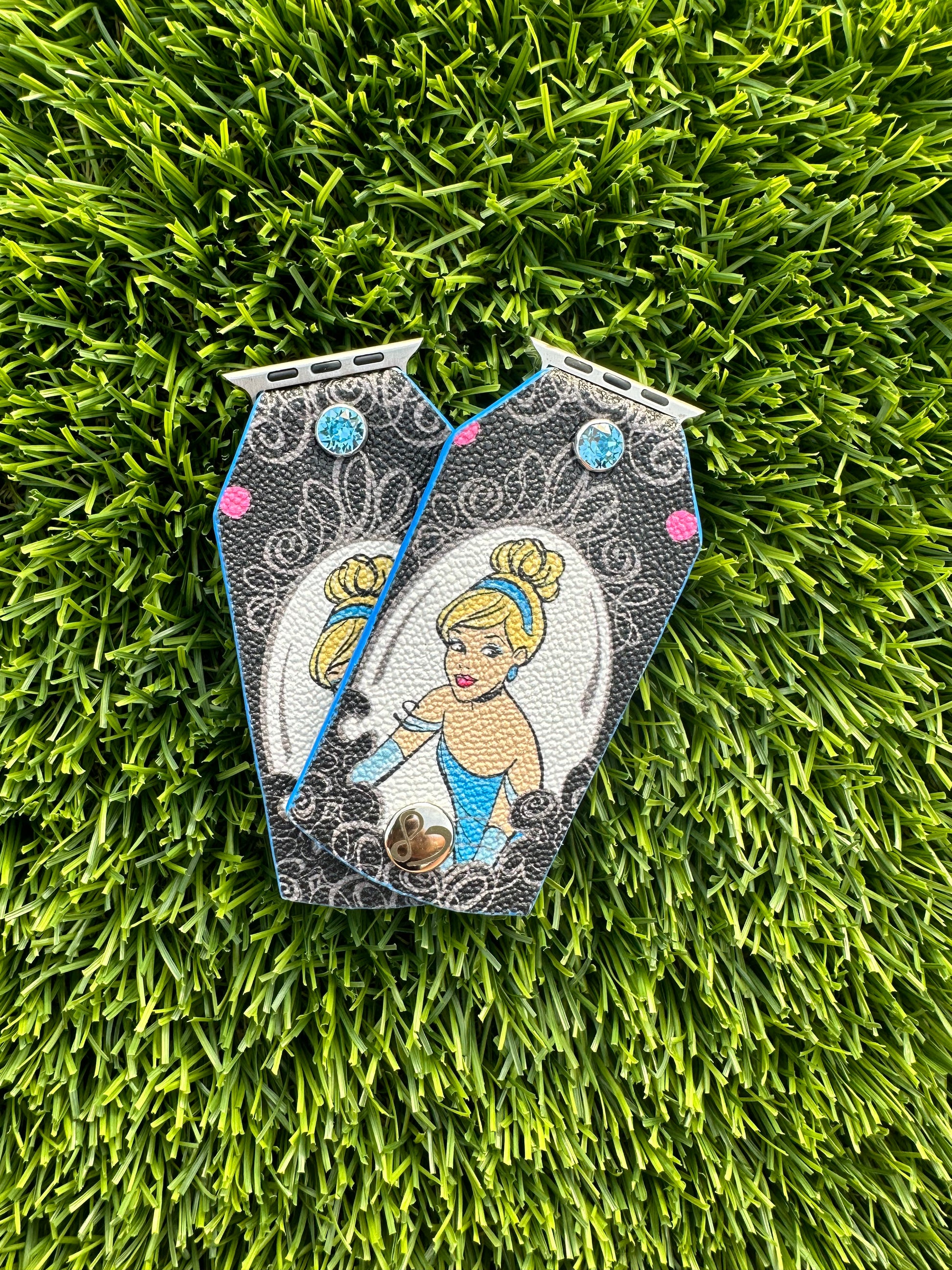 Esta es una auténtica banda de Dooney & Bourke. Está hecho de un material de lona revestido y forrado con un cuero rosa metalizado claro. La pintura del borde coincide con el color de fondo de la banda. El color de los cristales se correlaciona con la princesa correspondiente.