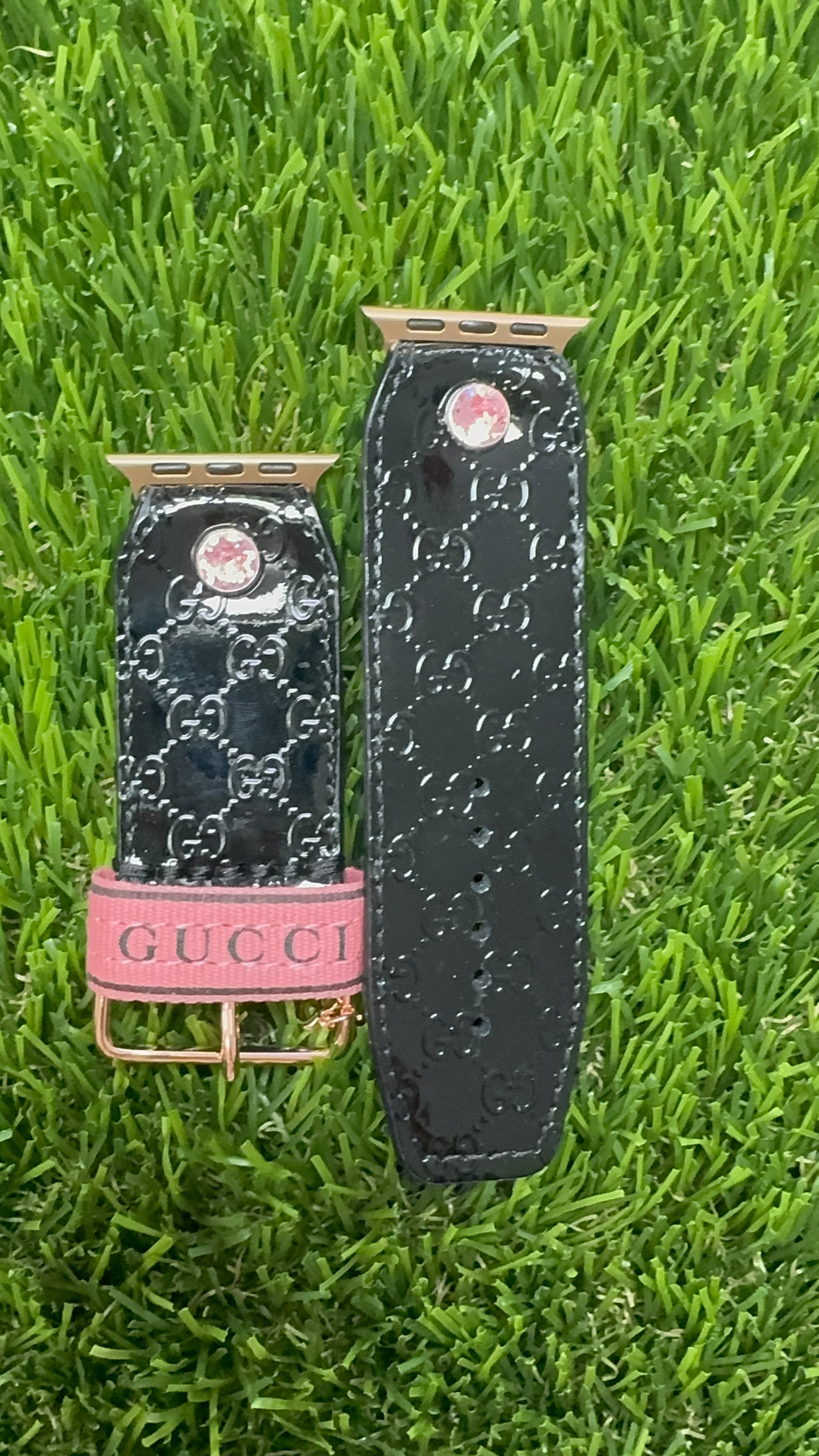 An authentic upcycled black Micro GG leather band. Your liner, crystal, and hardware are all customizable.