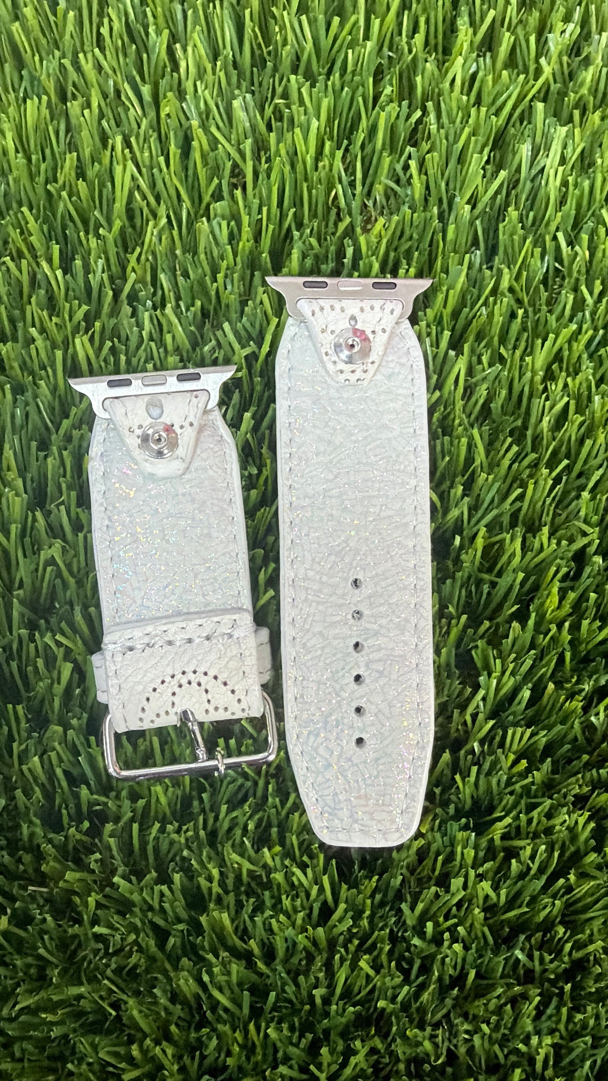 This is an authentic upcycled LV White Mahina. It is a leather band material with the iconic LV monogram as the hole. Hardware and liner are designed to your liking.