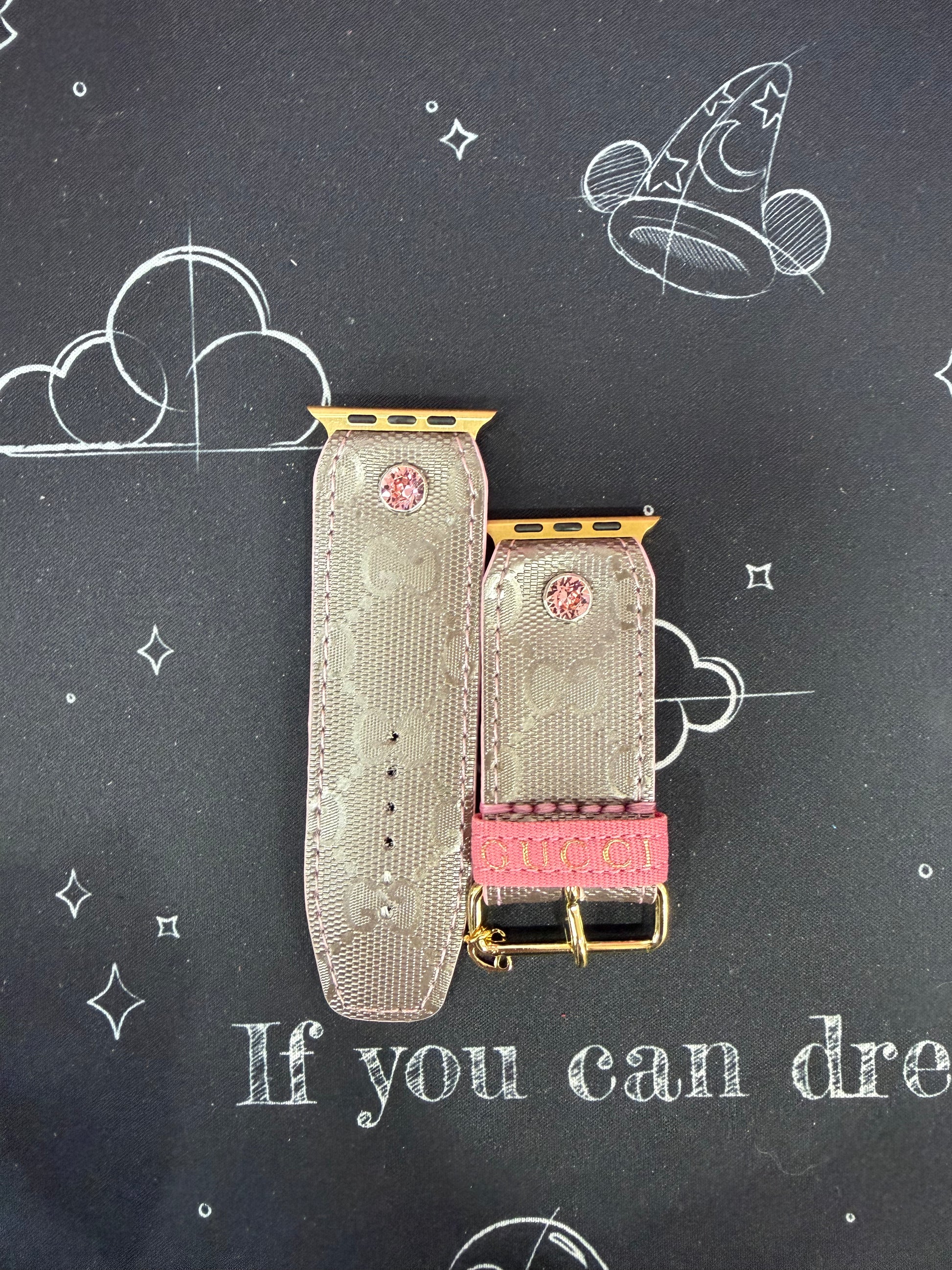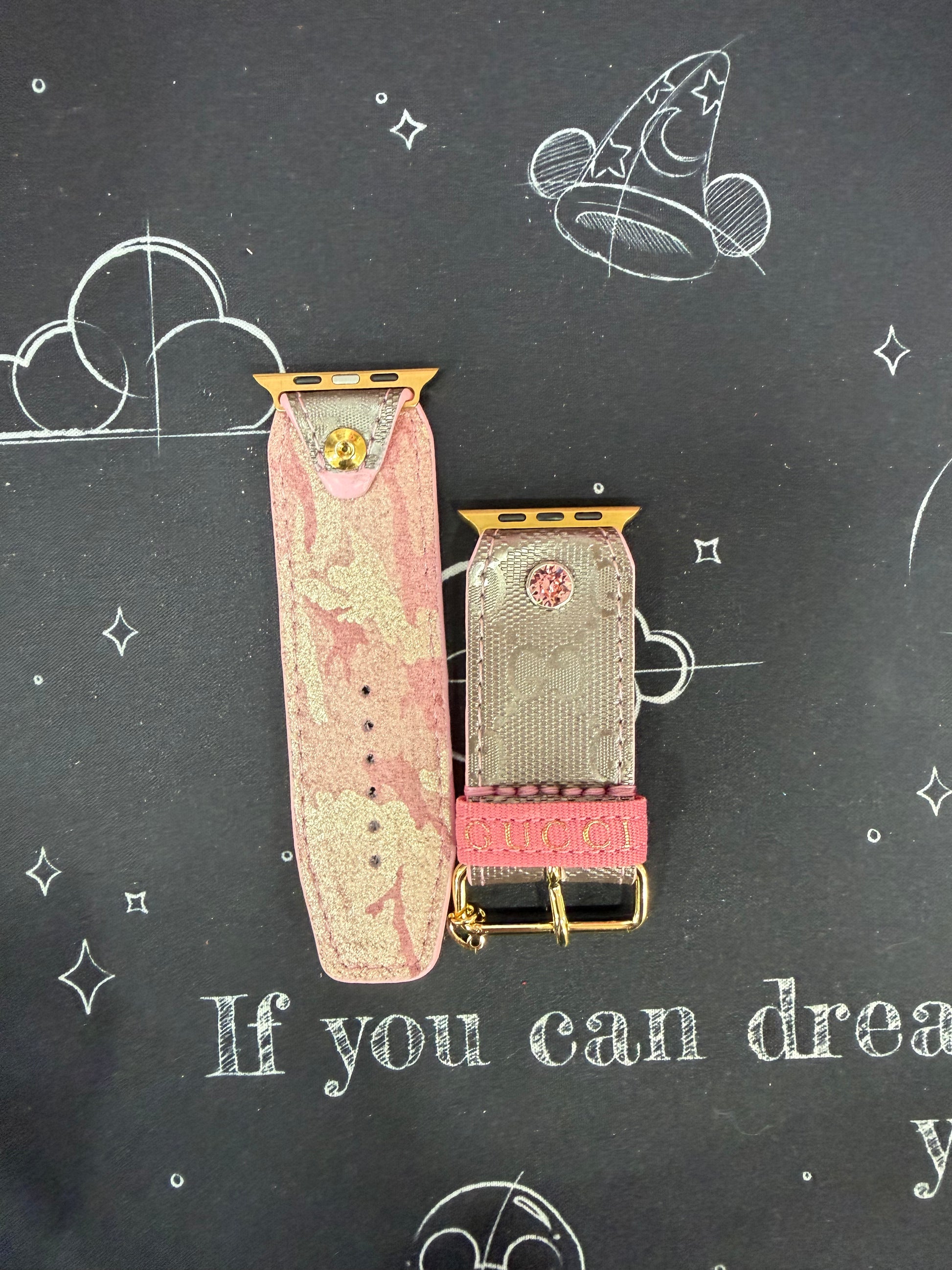 A coated canvas band made from an upcycled pewter GG. The liner is a pink camo with pink edge paint. Your crystal, and hardware are customizable. Please specify your choice in the notes section at checkout.