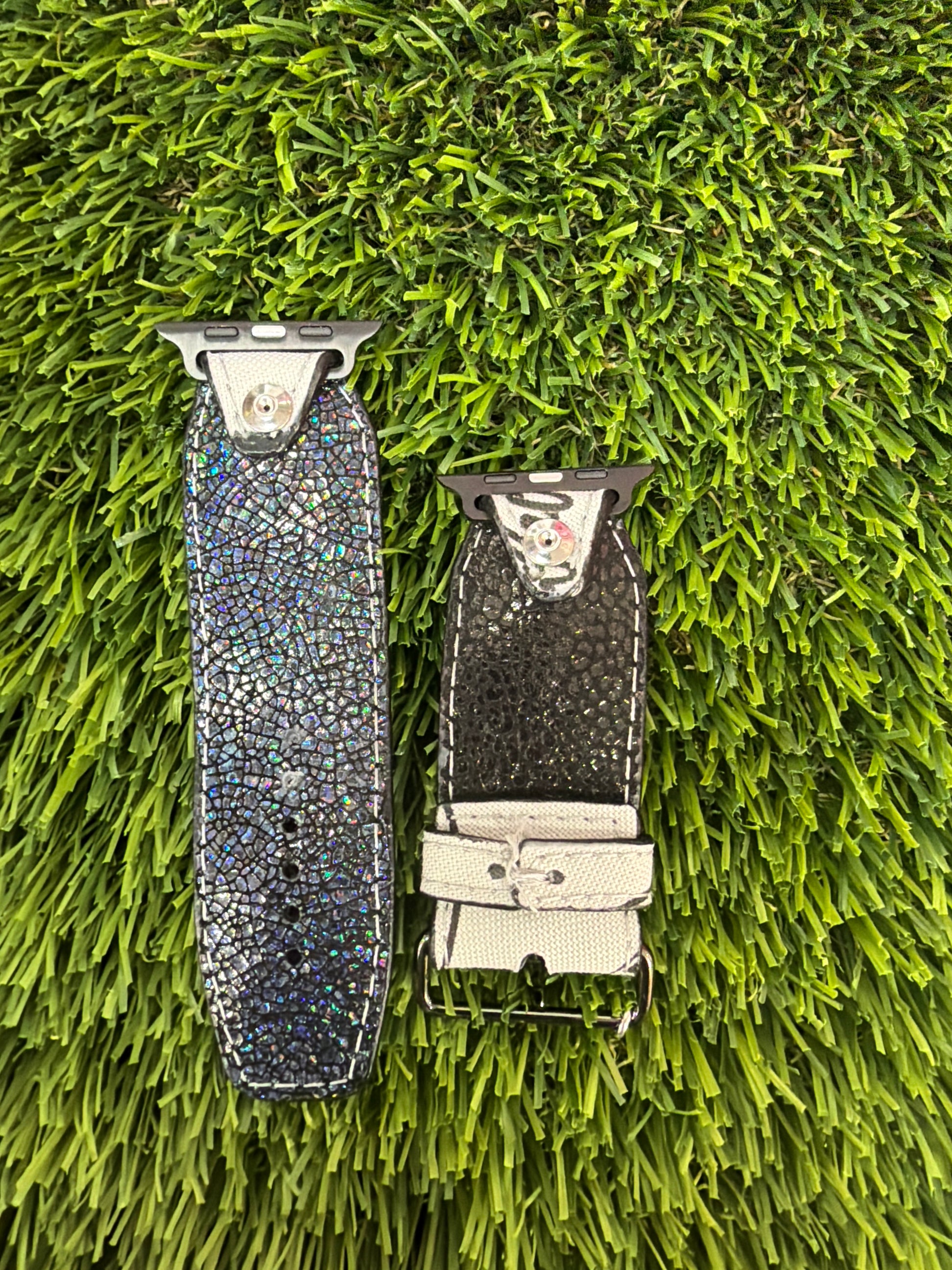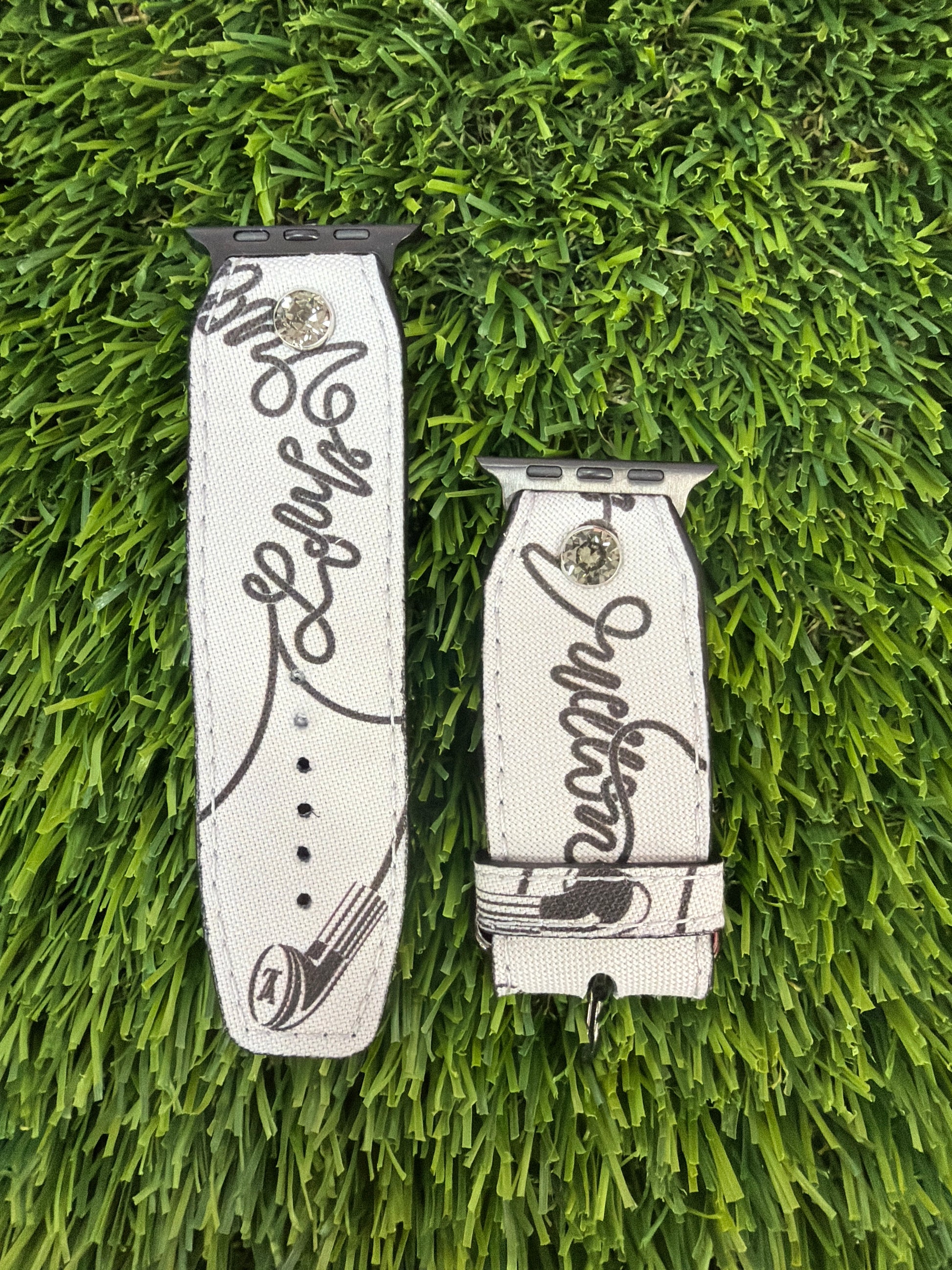 This is an upcycled LV fabic band. This band is made of cloth and contains the word Louis Vuitton and a headphone with the initals LV. This band can be embellished in the crystal and hardware of your choice.