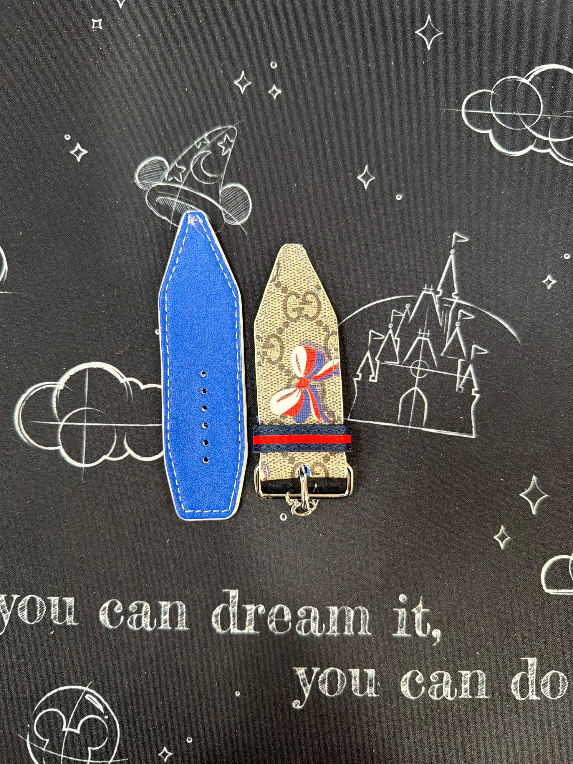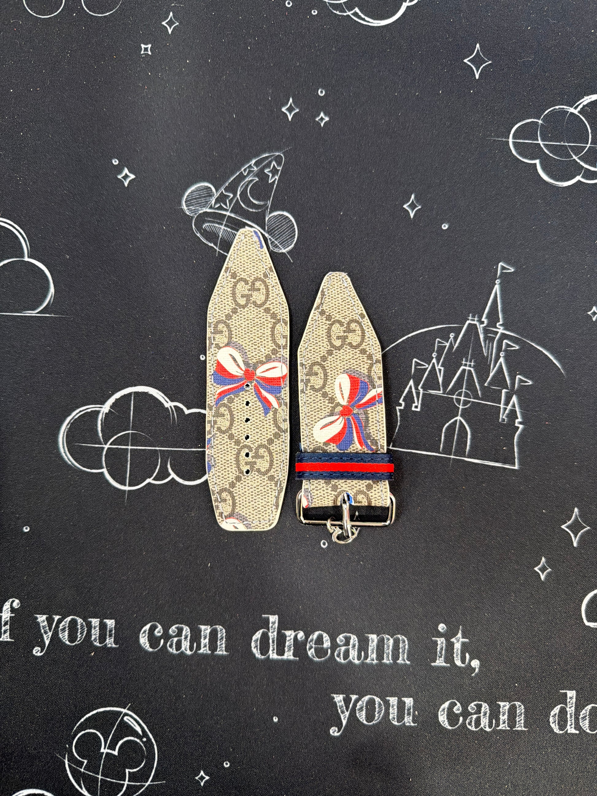 This is an authentic upcycled Gucci Bows. It is a canvas band material with the iconic GG monogram with one or two lady bugs sprinkled in.
