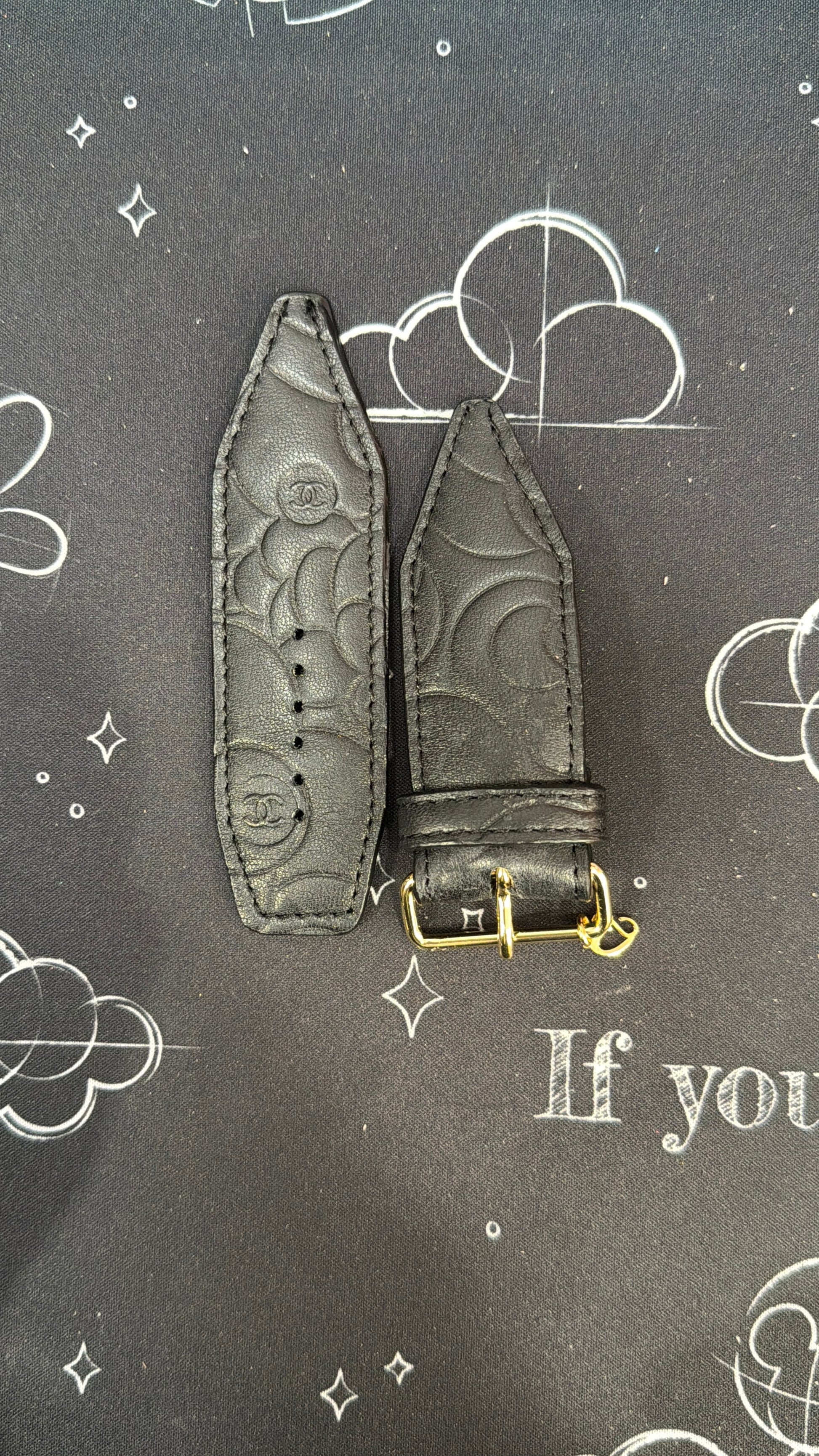 This is an authentic upcycled Chanel band. This band is made leather and contains a stitched Camillia flower pattern in black. Liner is black lambskin with matching edge paint. Crystal and hardware are customizable.