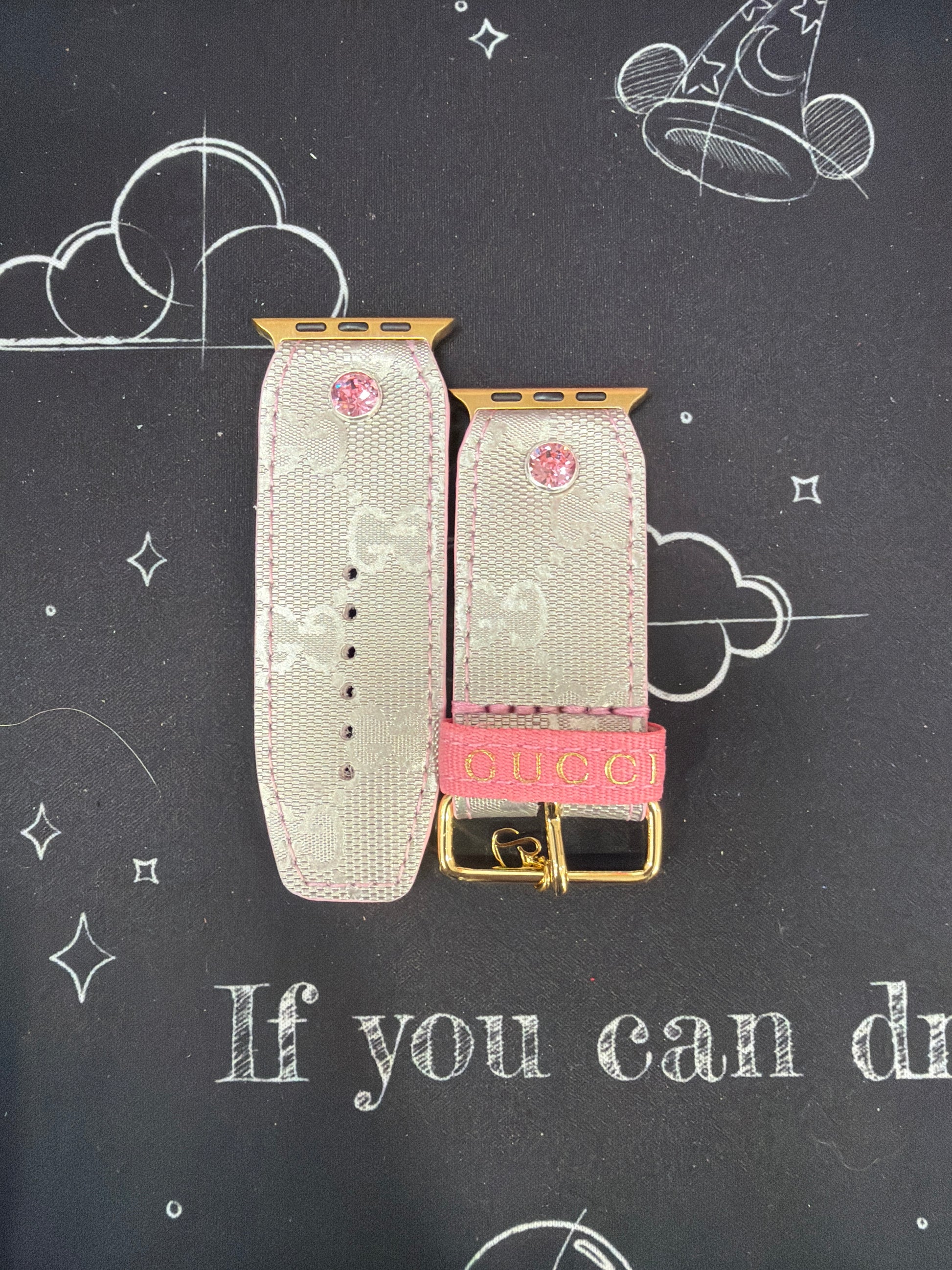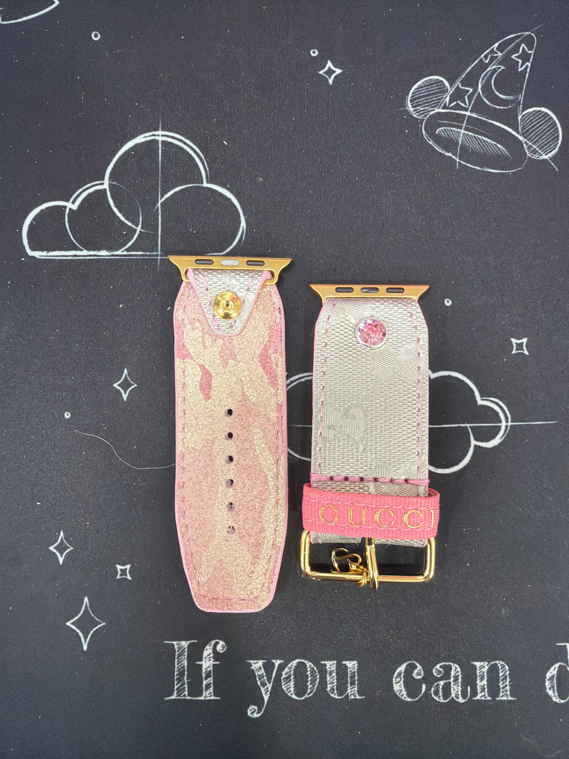 A coated canvas band made from an upcycled silver GG. The liner is a rose glitz camo, pink edge paint and pink ribbon keeper. Hardware and crystals are customizable. Please specify your choice in the notes section at checkout.