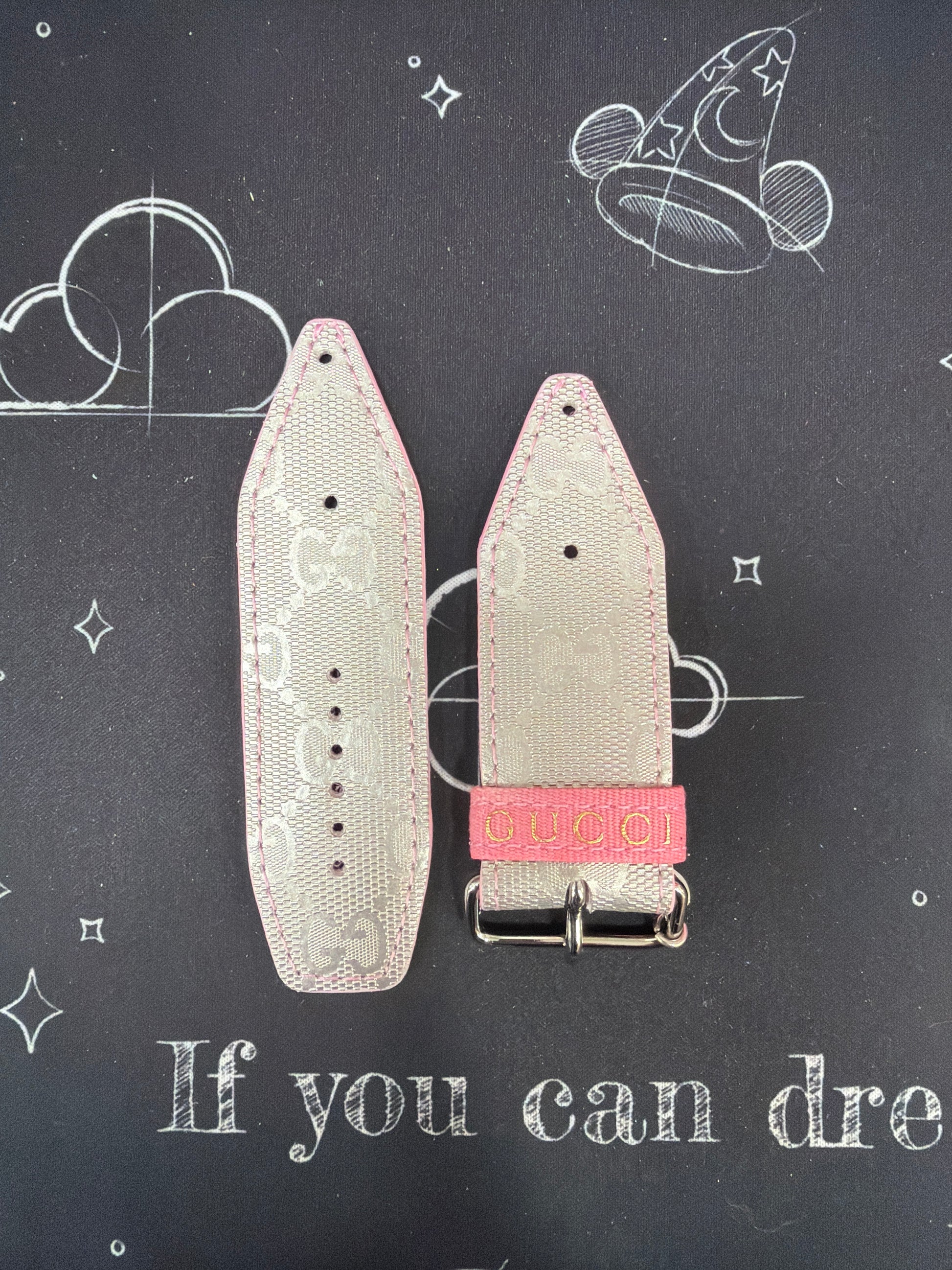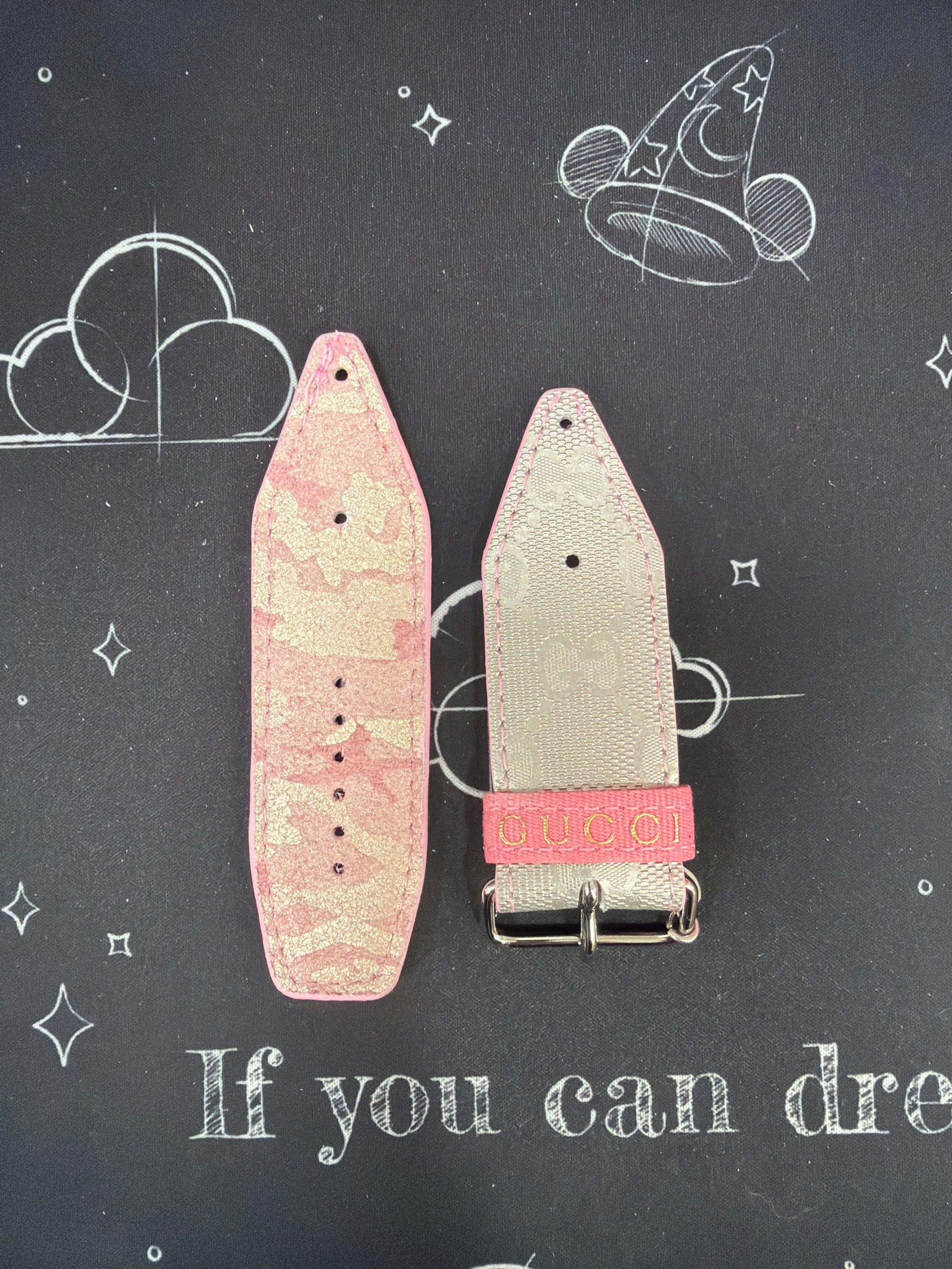 A coated canvas band made from an upcycled silver GG. The liner is a rose glitz camo, pink edge paint and pink ribbon keeper. Hardware and crystals are customizable. Please specify your choice in the notes section at checkout.