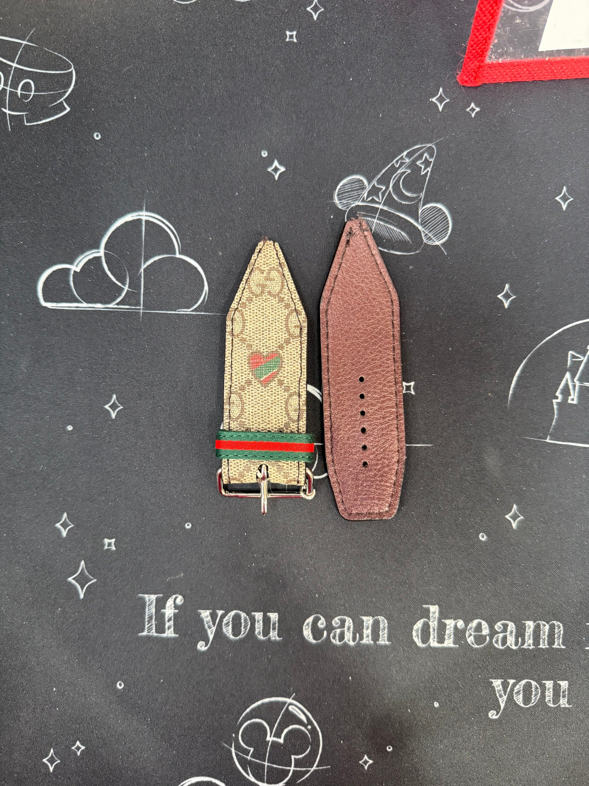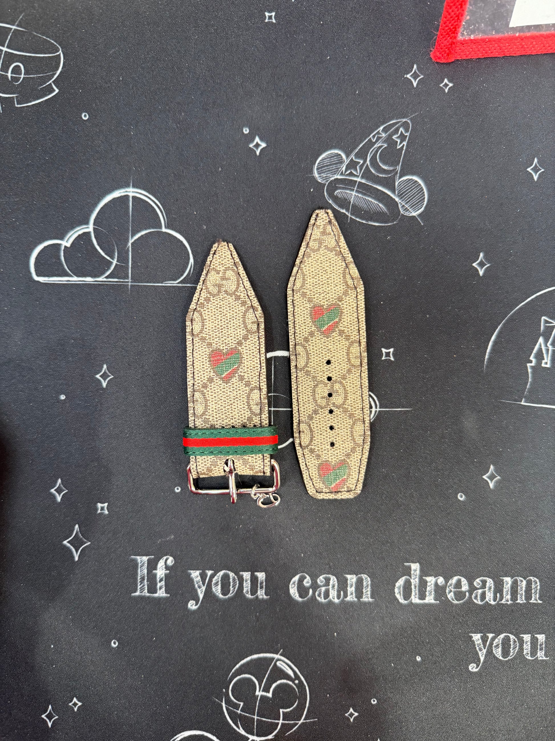 The authentic upcycled Gucci Rare GG Christmas Hearts is a coated canvas band material in tan band with hearts. The liner is a metallic brown and the edge paint and thread are a dark brown.