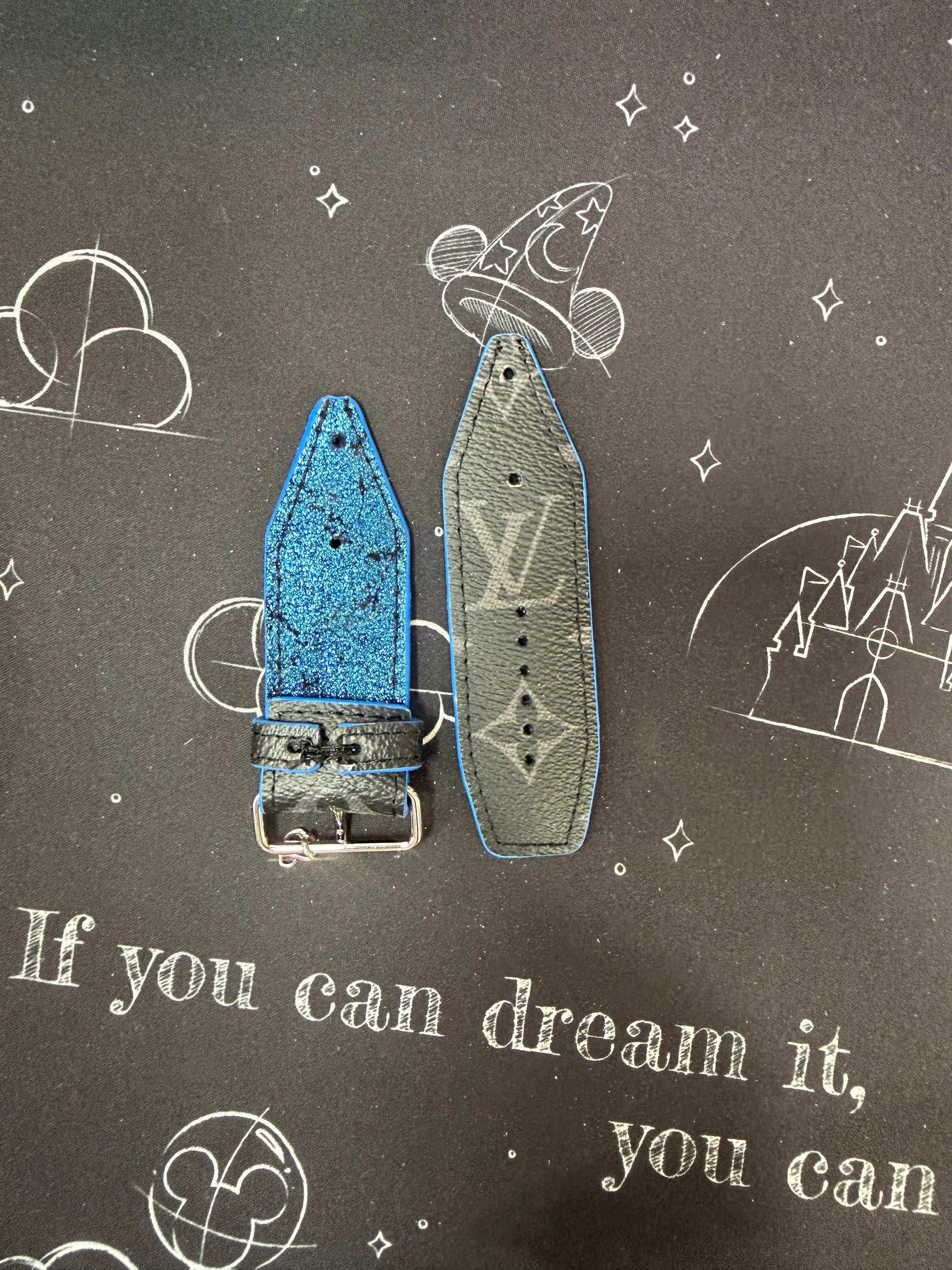 This is an authentic upcycled LV Monogram Eclipse. It is a canvas band material with the iconic LV monogram. The liner is a royal blue shimmer and matching edge paint. Hardware and crystals are customizable.