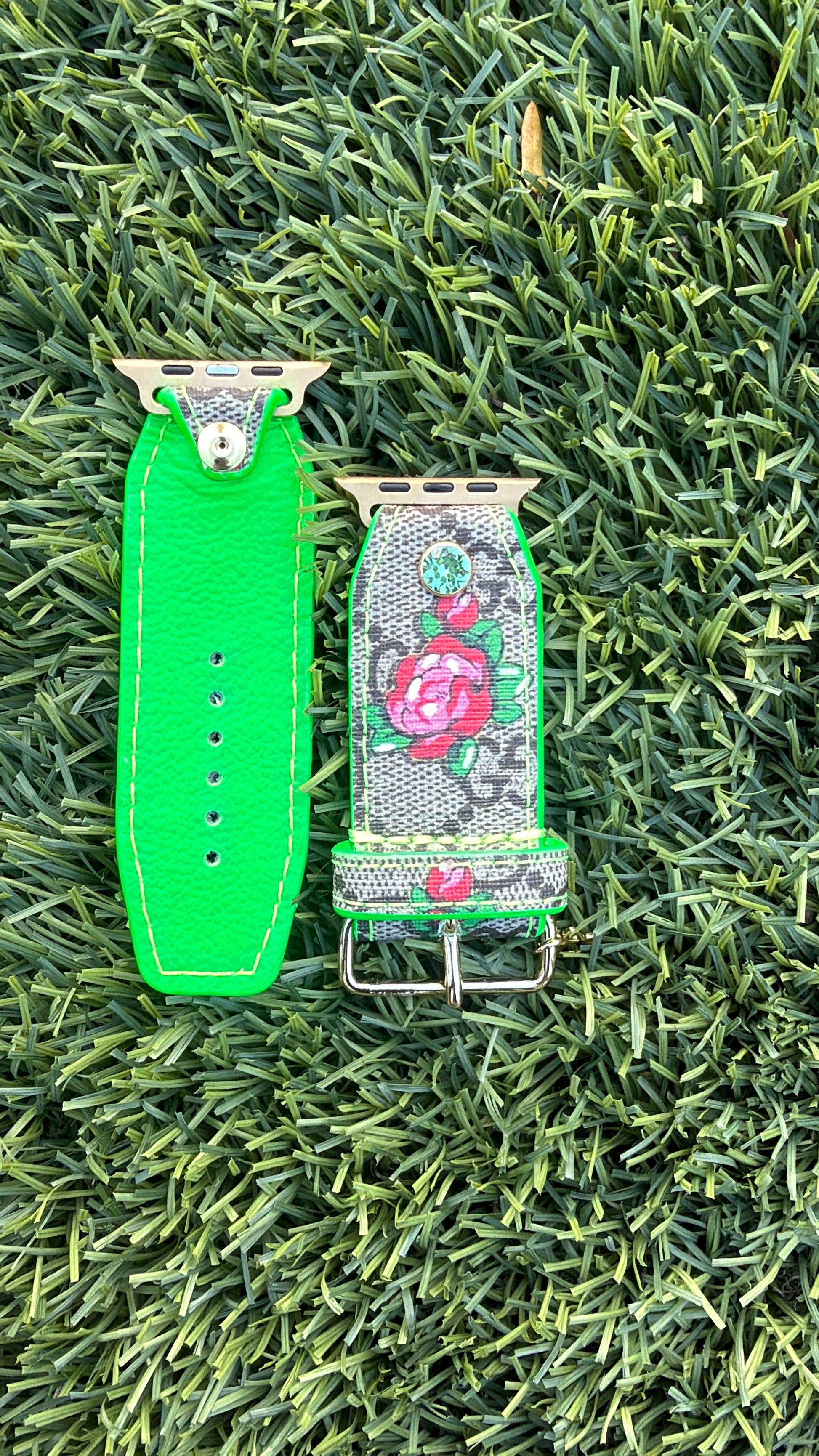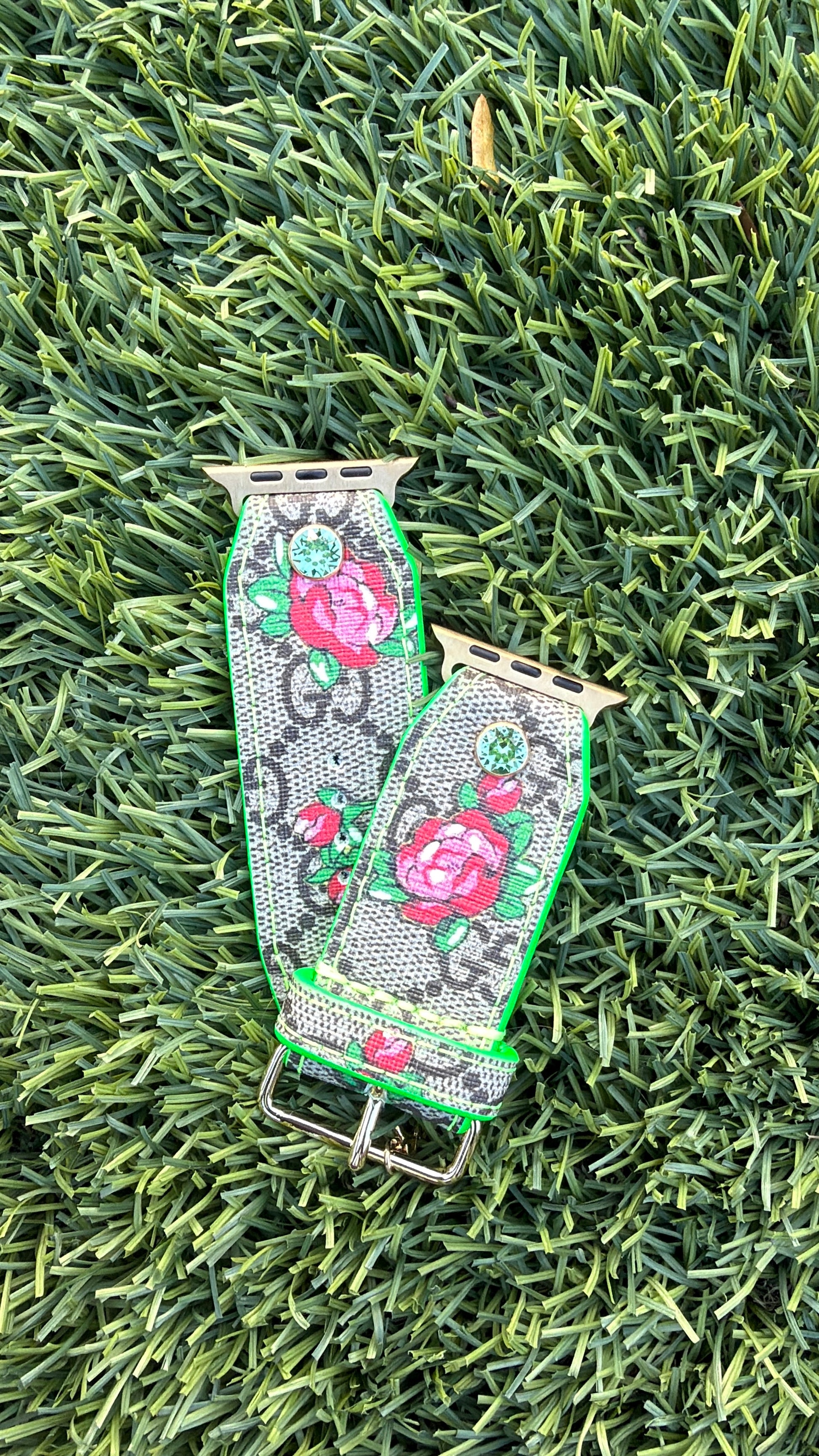 This is an authentic upcycle Gucci. It is a canvas band material with the iconic GG monogram with a variety of roses, rosebuds and rose petals in the pattern.