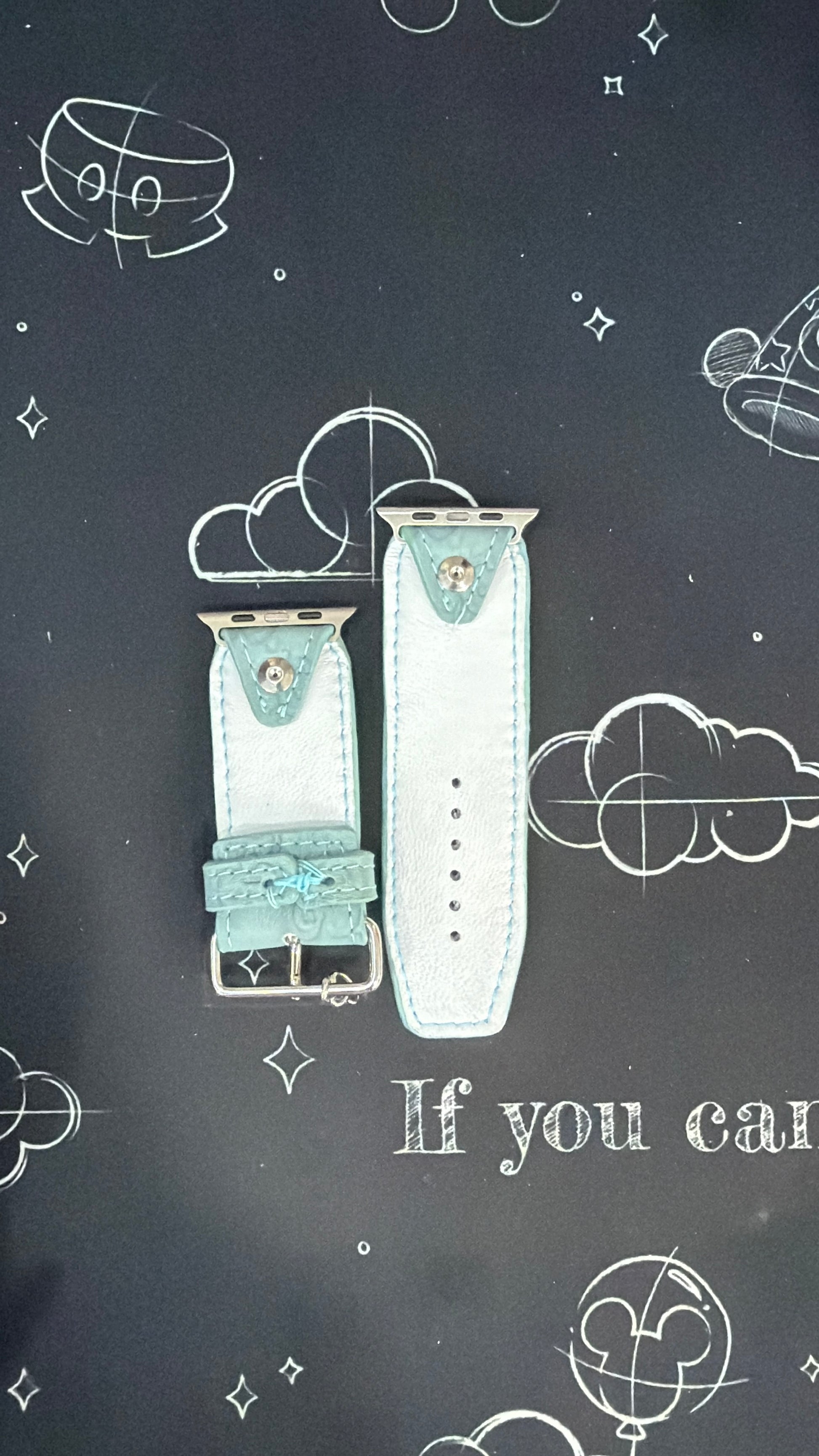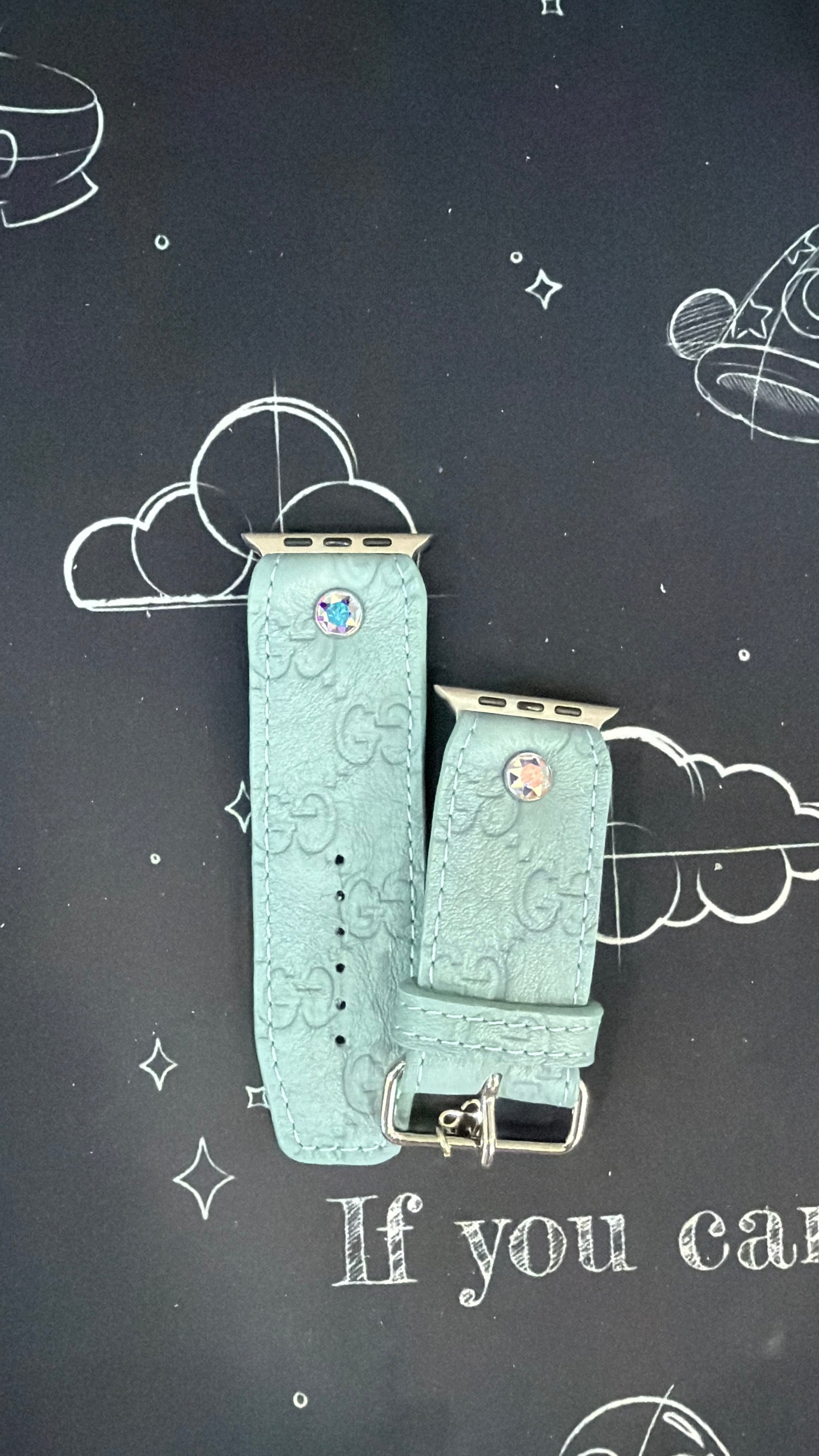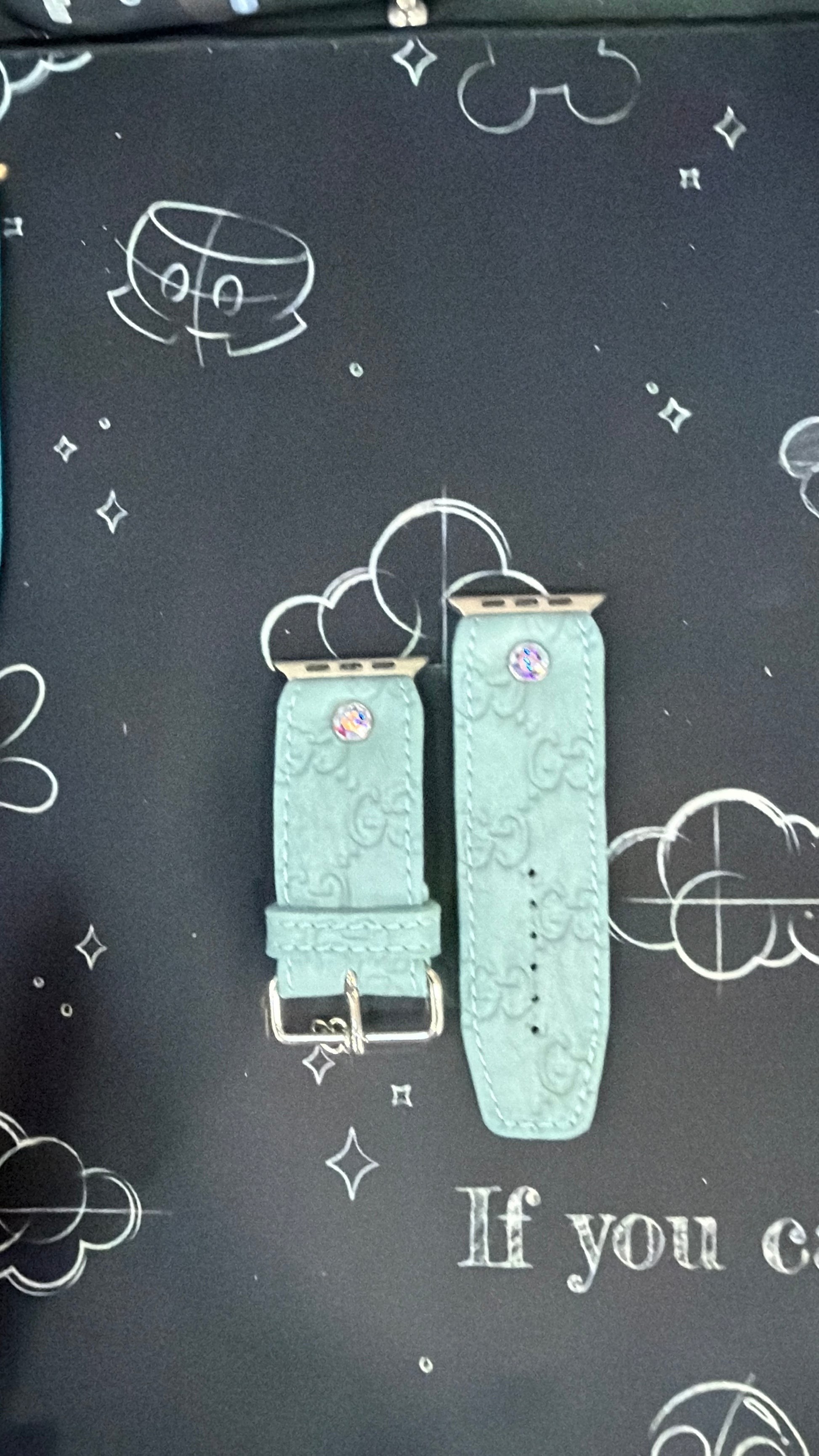 This leather GG in a jungle green color. This band sports the iconic GG monogram. The liner white leather with matching edge paint and thread. Hardware and crystals are customizable.