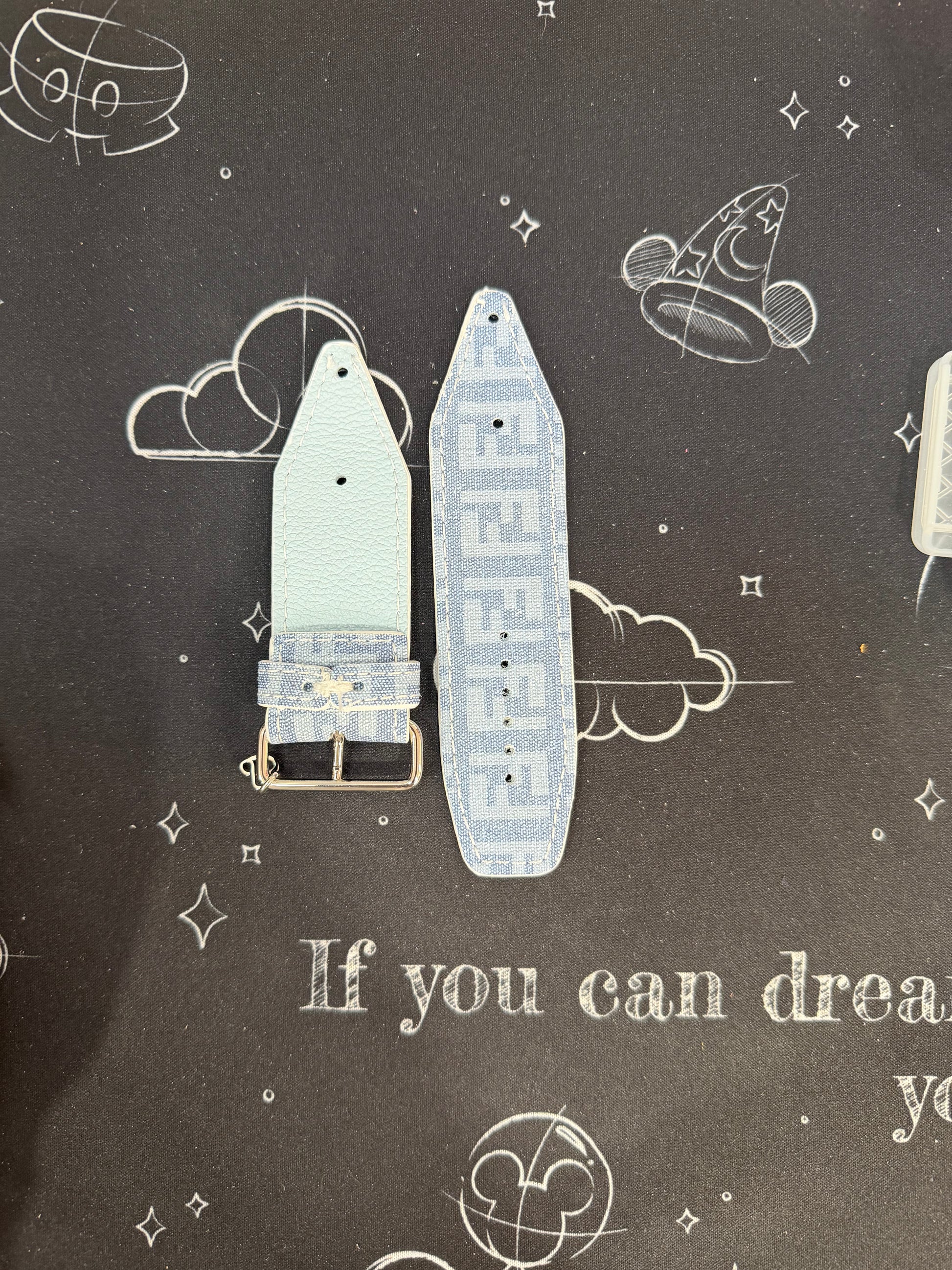 An authentic upcycled mini denim Fendi. The band is a coated canvas with denim color shades.