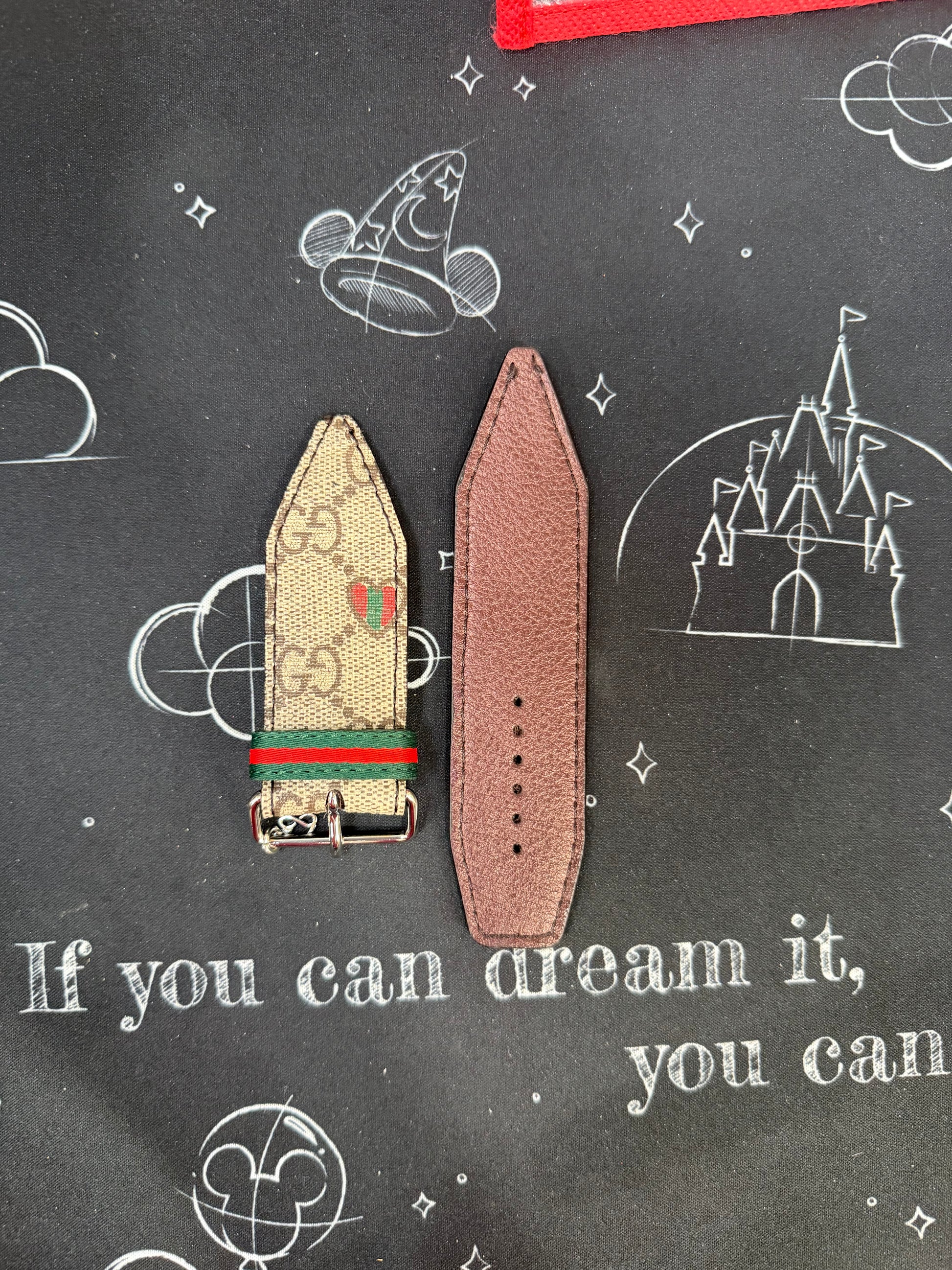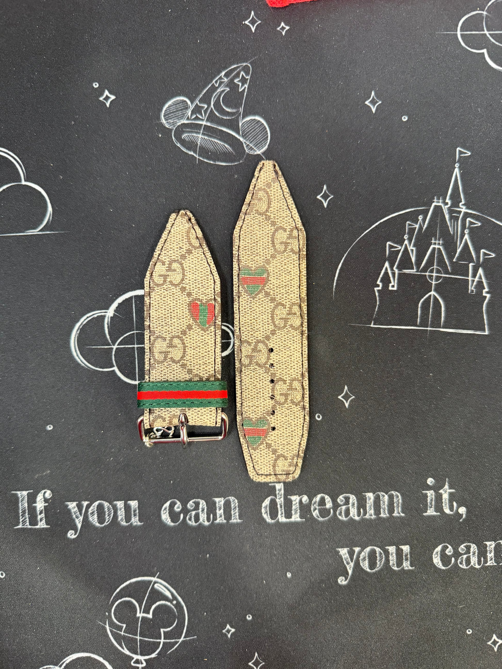 The authentic upcycled Gucci Rare GG Christmas Hearts is a coated canvas band material in tan band with hearts. The liner is a metallic brown and the edge paint and thread are a dark brown.
